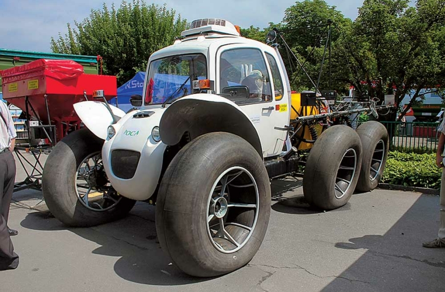 Один из самых оригинальных экспонатов недавно прошедшей в Киеве XII Международной агропромышленной выставки – самоходный опрыскиватель «Роса» от белорусской компании «Агромашресурс». По схеме он напоминает российские вездеходы «Трэкол», снабженные внушительными шинами сверхнизкого давления. Это позволяет легко двигаться даже по болотистой почве. Благодаря низкому удельному давлению на грунт машина практически не повреждает посевы: после ее проезда по кукурузе последняя поднимается уже на 7-й день. Опрыскиватель оборудован 1,5-литровым дизелем Kubota мощностью 31 л. с. Интересно, что в отличие от других испытанных на этой машине двигателей он может работать в условиях, когда воздух насыщен ядохимикатами.
