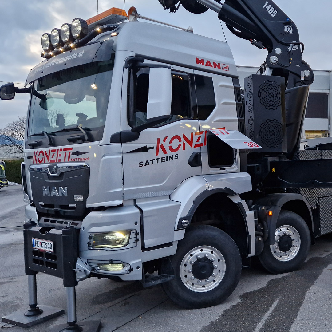 Цікаво, що для такого крана-маніпулятора шасі оснащується п’ятьма аутригерами – чотирма боковими та одним під переднім бампером. В даному випадку замовником виступила німецька компанія Konzett Satteins, в автопарку якої працює вже кілька таких машин.