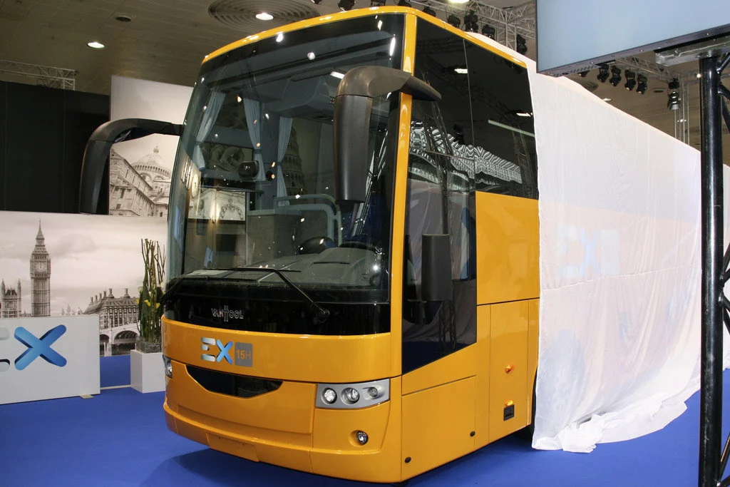 Новый туристический автобус Van Hool EX спроектирован специально для развивающихся рынков и будет выпускаться на недавно открытом заводе в Македонии. Модель отличается плавными линиями кузова и привлекает вниманиями высокими задними стопами на светодиодах LED. Для удобства водителя и рядом сидящего гида передний свес машины был удлинен на 100 мм – до 2890 мм. Водителю также придется по душе новая, развернутая к нему приборная панель, а гиду – место для работы с iPad для чего имеется соответствующий разъем. Появились иные наружные зеркала, уменьшающие мертвые зоны.