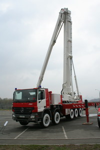 Пожарный коленчатый подъемник изготовлен известной финской фирмой Bronto Skylift. В Киеве уже имеется несколько машин данной марки, но до новинки им по высоте подъема ой как далеко. Последняя модель – F90HLA способна поднять люльку с 4 пожарниками на высоту в 90 метров! Впечатляет и автомобиль, на котором смонтирован подъемник – это 5-осное (10х6) грузовое шасси Mercedes-Benz Actros 4150, с двигателем мощностью 500 л. с. Соизмерима с высотой подъема люльки и цена пожарного гиганта – столичным властям он обошелся ни много, ни мало в 1,5 млн. евро!
