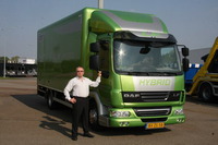 Компания DAF Truck начала серийное производство гибридного грузовика LF в декабре прошлого года – первой среди европейских производителей. Машина полной массой 12 т оснащается гибридной силовой установкой параллельного типа. В паре с турбодизельным агрегатом в 160 л.с. работает электромотор, который помогает машине при старте, в том числе в режиме старт-стоп на кратковременных остановках. Питает двигатель литий-ионные аккумуляторы, которые подзаряжаются при торможении – в режиме рециркуляции. Степень зарядки батарей в процентах водитель может легко контролировать по дисплею борт-компьютера. Гибридный LF расходует на 20% топлива меньше, нежели чисто дизельный «собрат», и отвечают строгим экологическим стандартам EEV. Снижению расхода топлива помогает и автоматическая трансмиссий Eaton, имеющая также и ручной режим управления. Подробный рассказ о тест-драйве читайте в майском номере журнала "Коммерческие автомобили".