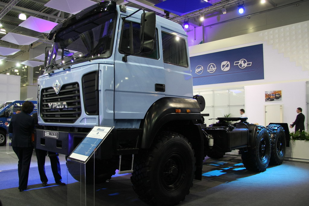 На стенде «АЗ «УРАЛ» в Москве, прежде всего, привлекала внимание новинка завода – седельный тягач УРАЛ-44202-3211-80М. Кабина имеет обновленную переднюю часть, отличается улучшенной эргономикой рабочего места водителя и оснащена спальной полкой. Полная масса автопоезда – 38 т. Рядный 6-цилиндровый турбодизель ЯМЗ-53642 (6,65 л) развивает 312 л.с. Коробка передач – ZF, 9-ступенчатая.