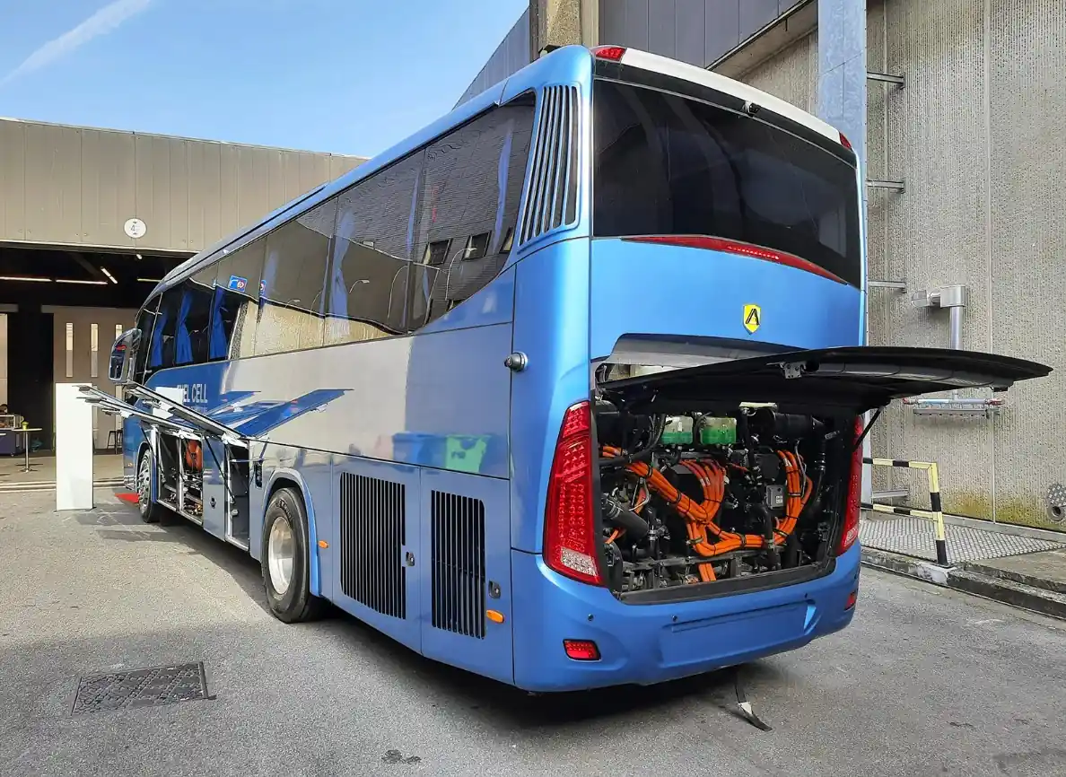 Почнемо з 53-місної туристичної моделі Audace 1050, яка працює на водневих паливних елементах. Машина виготовлена на китайському підприємстві Marcopolo спільно з компаніями Sinosynergy та Allenbus.