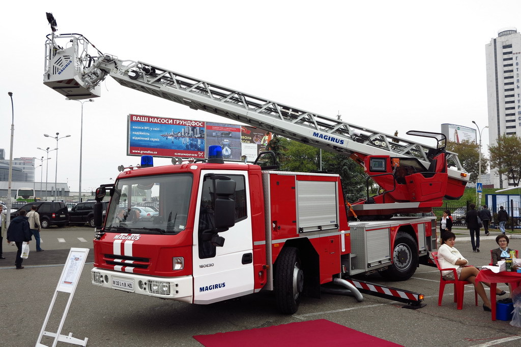 На «ПожТех-2012» пожарную автолестницу IVECO Magirus M32L привезло ООО «Витанд Групп» – партнер компании «Ивеко Магирус» в Украине. Отличительной особенностью автолестницы является уникальная система компьютерной стабилизации Magirus CS. Эта система автоматически демпфирует колебания лестницы во время работы, (при порывах ветра, прыжках людей, падении предметов в люльку). Кроме того, машина оборудована уникальной системой выносных опор Magirus Vario Ass. Она позволяет компенсировать вертикальные перепады поверхности колебания до 800 мм. Опорные плиты вместе с задними колесами образуют надежных точек опоры. При размещении опорной плиты на мягком грунте нагрузка равномерно перераспределяется на всю балку опоры.