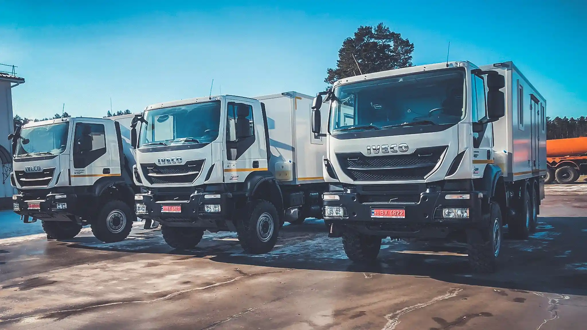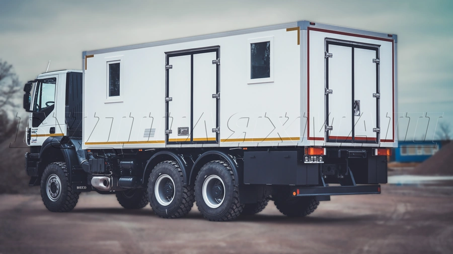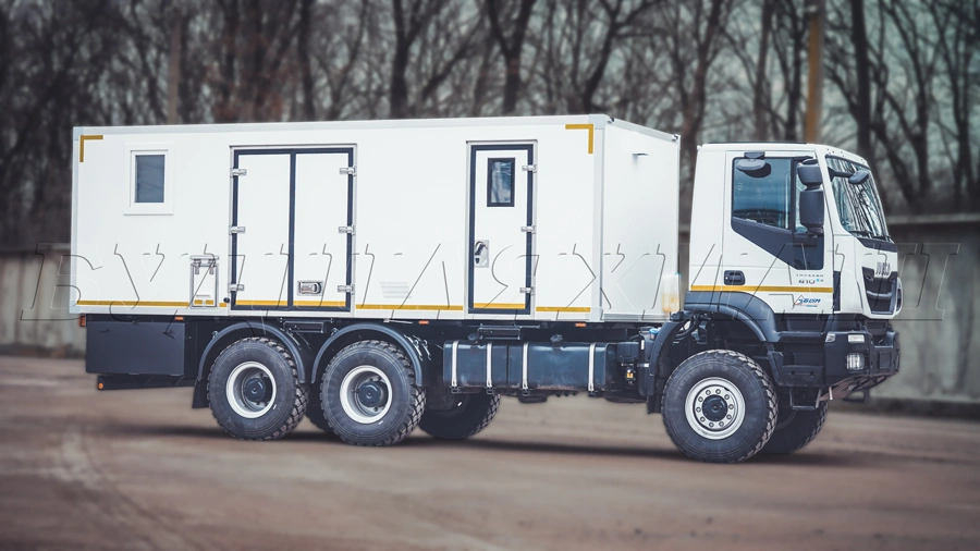 Група компаній "Будшляхмаш" днями відправила замовнику кілька пересувних майстерень АСАМ, виконаних на повнопривідних шасі IVECO Trakker AD380T41W (6х6). Нові машини призначені для перевезення ремонтно-аварійних бригад та спеціального обладнання. Кузов-фургон розділений на три функціональні відсіки. Перший з них - спальний, у якому на кшталт купе залізничного вагона розміщено чотири полиці для відпочинку працівників. Тут встановлені відкидний столик, обігрівач, а також дві шафи для змінного одягу. Стіни оббиті матеріалом, що легко миється.