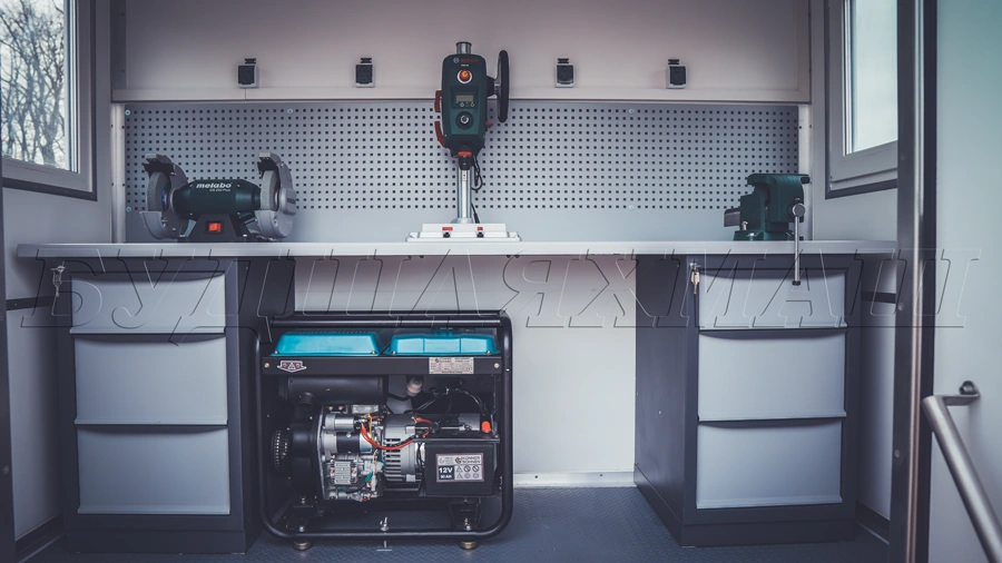 Другий відсік – слюсарний, де розташовані лещата для фіксації деталей, точильний та потужний свердлильний верстати. Спеціальний інструмент завжди легко дістати з шухляд металевого стелажу. І нарешті в кормі фургона розміщується енергетичний відсік, в якому змонтовано дизельний генератор потужністю 6 кВт, що живить все спеціалізоване обладнання пересувної майстерні АСАМ.