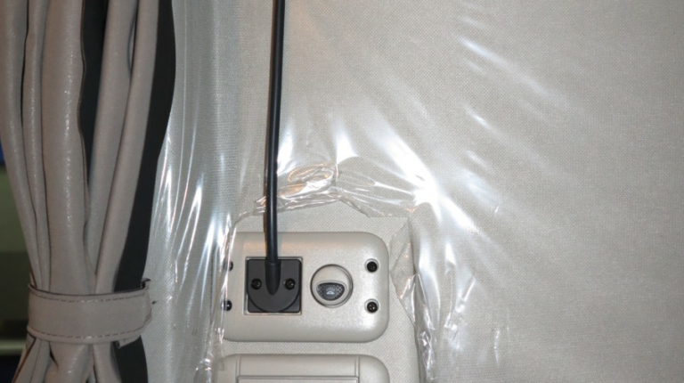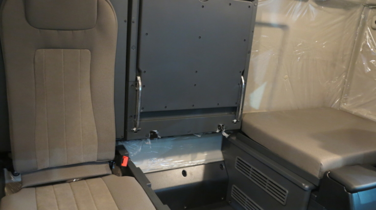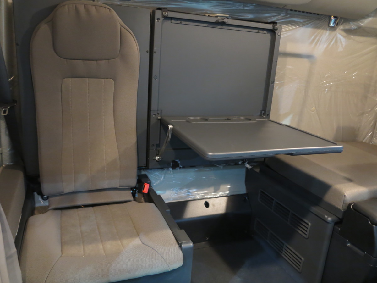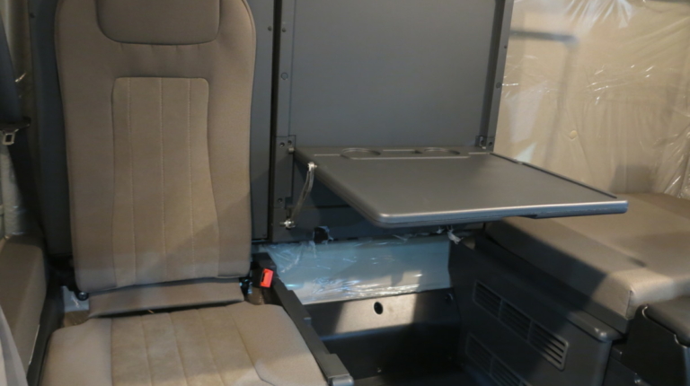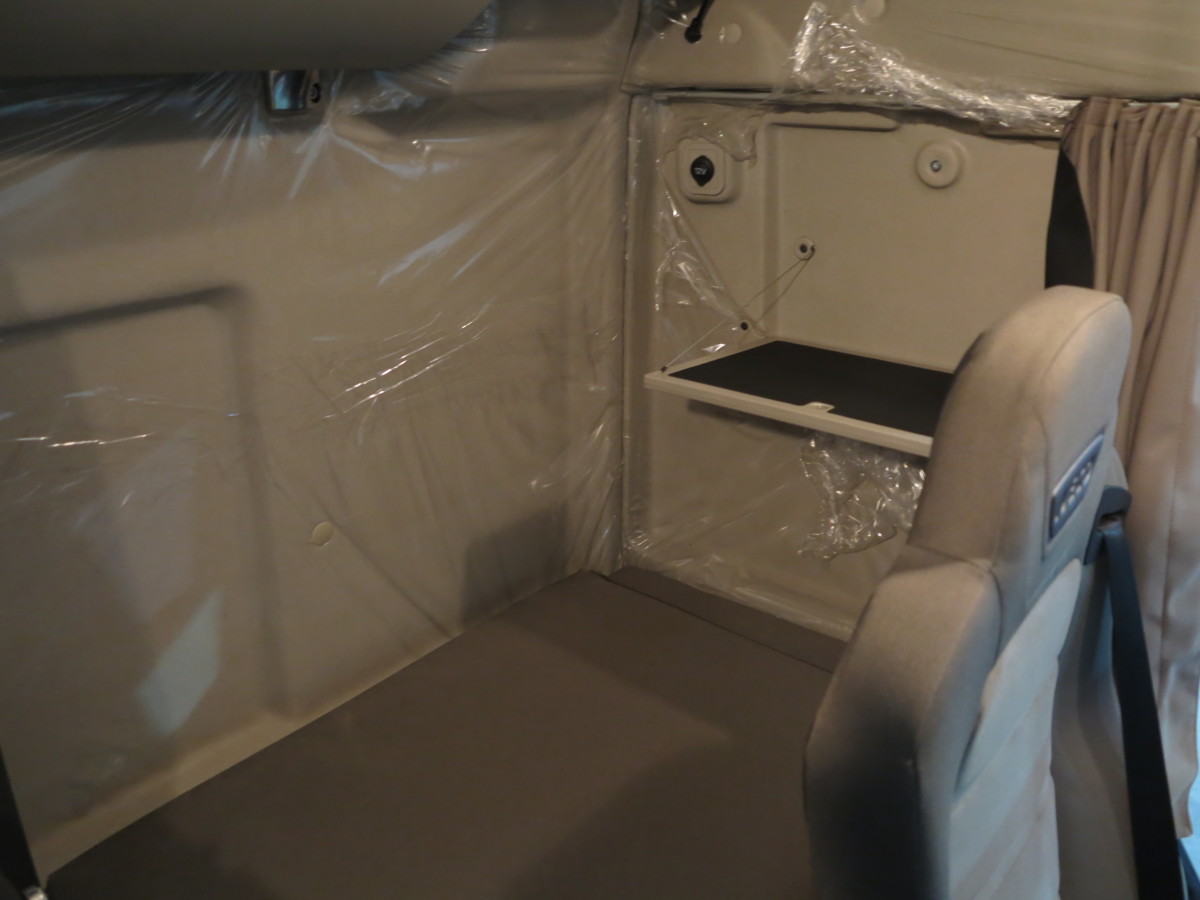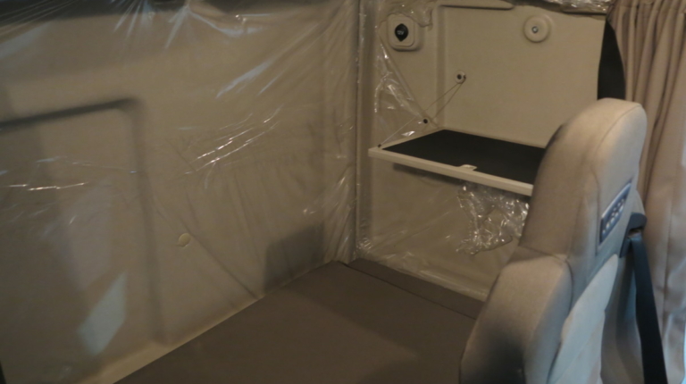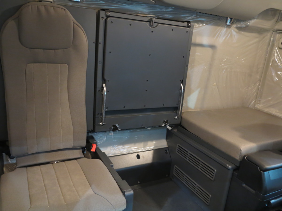 Здесь две спальные полки. Нижняя полка сделана трехсекционной. Водитель или напарник может разместится на отдельном кресле под спальной полкой, справа. Средняя секция нижней полки поднимается и образует удобный столик. За креслом водителя предусмотрен еще один откидной столик – под ноутбук.