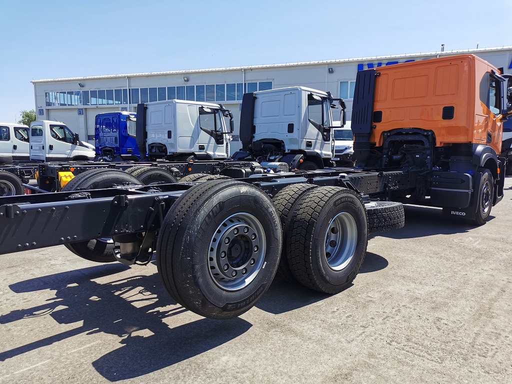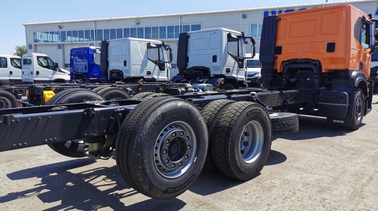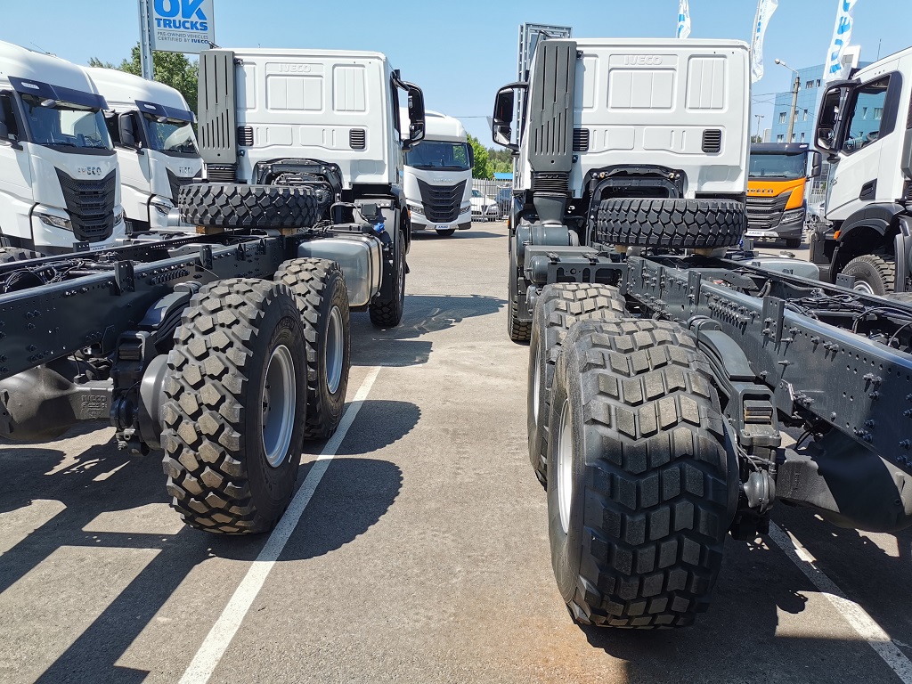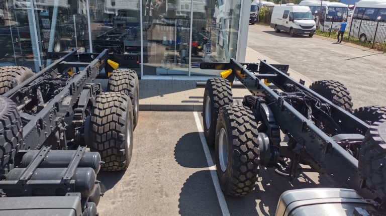 В експозиції можна побачити двовісні та тривісні повнопривідні шасі T-Way, хоча машини доступні також у варіантах 6х4, 8х4, а також 8х8. Модель 4х4 має потужну раму з лонжеронами, виготовленими зі сталі завтовшки 7,7 мм, а варіант 6х6 – завтовшки вже 10 мм. У передній підвісці вже стандартно використовуються трилистові ресори. Тут застосовуються параболічні ресори, які більш еластичні на бездоріжжі.