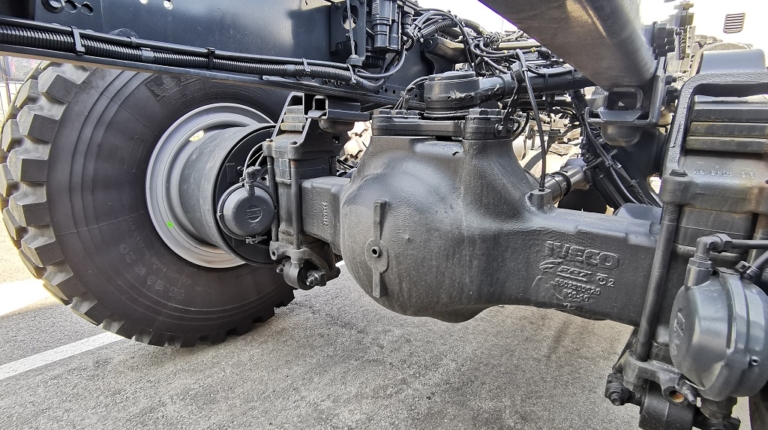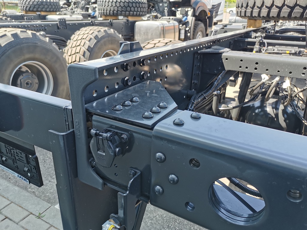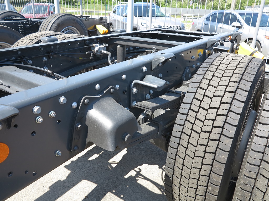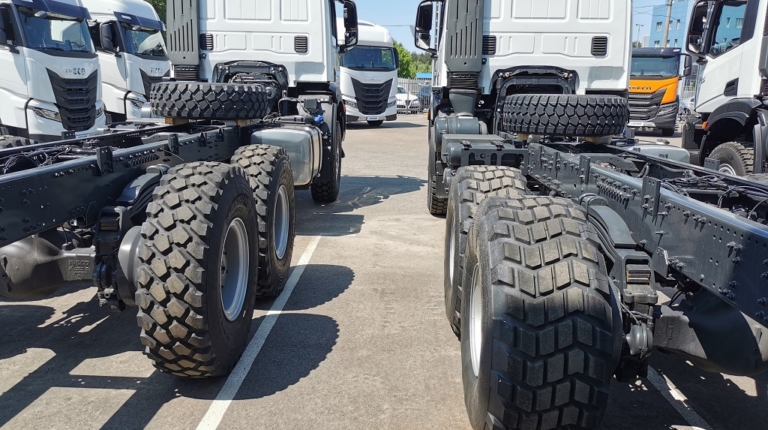 На одному тривіснику встановлені шини 14.00 R20, а на другому – ширше «взуття» розмірності 525/65 R20,5. В останньому випадку це дозволило підняти повну масу з 26 500 кг до 33 500 кг. Відповідно збільшилася і вантажопідйомність – з 16 до 23 т. Таке тривісне шасі може працювати у складі автопоїзда повною масою до 60 т.