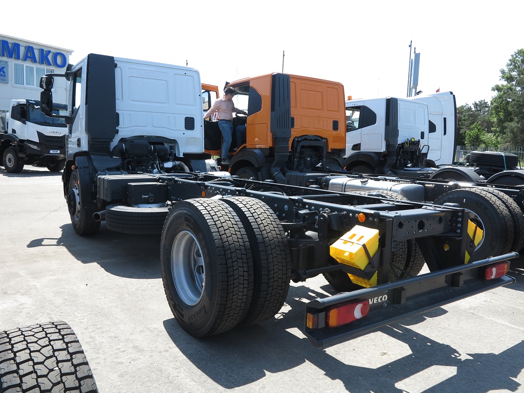 На території АМАКО у с. Проліски також можна побачити і середньотоннажні вантажівки сімейства EuroCargo. Такі моделі сьогодні користуються добрим попитом у комунальників. На них встановлено посилену підвіску коліс – на напівеліптичних ресорах, а також вал відбору потужності. На подібних шасі можуть монтуватися різні надбудови: сміттєвози, самоскидні кузови, а також цистерни місткістю до 14 000 л.