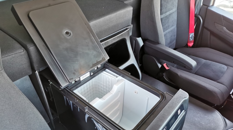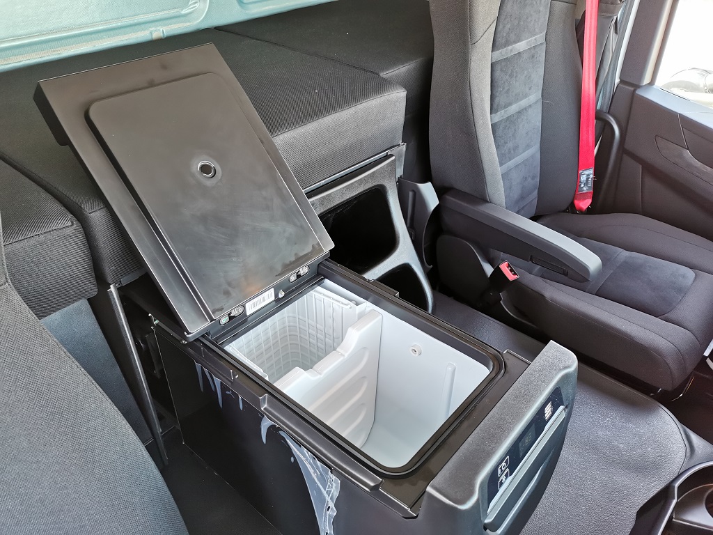В одній під нижньою спальною полицею – цілих два холодильники по 50 л, сидіння напарника зроблено поворотним, а на панелі приладів встановлений екран мультимедійної системи. В іншій машині – нижня спальна полиця трансформується в столик з двома місцями з обох боків, за типом бічного плацкартного місця у вагоні.