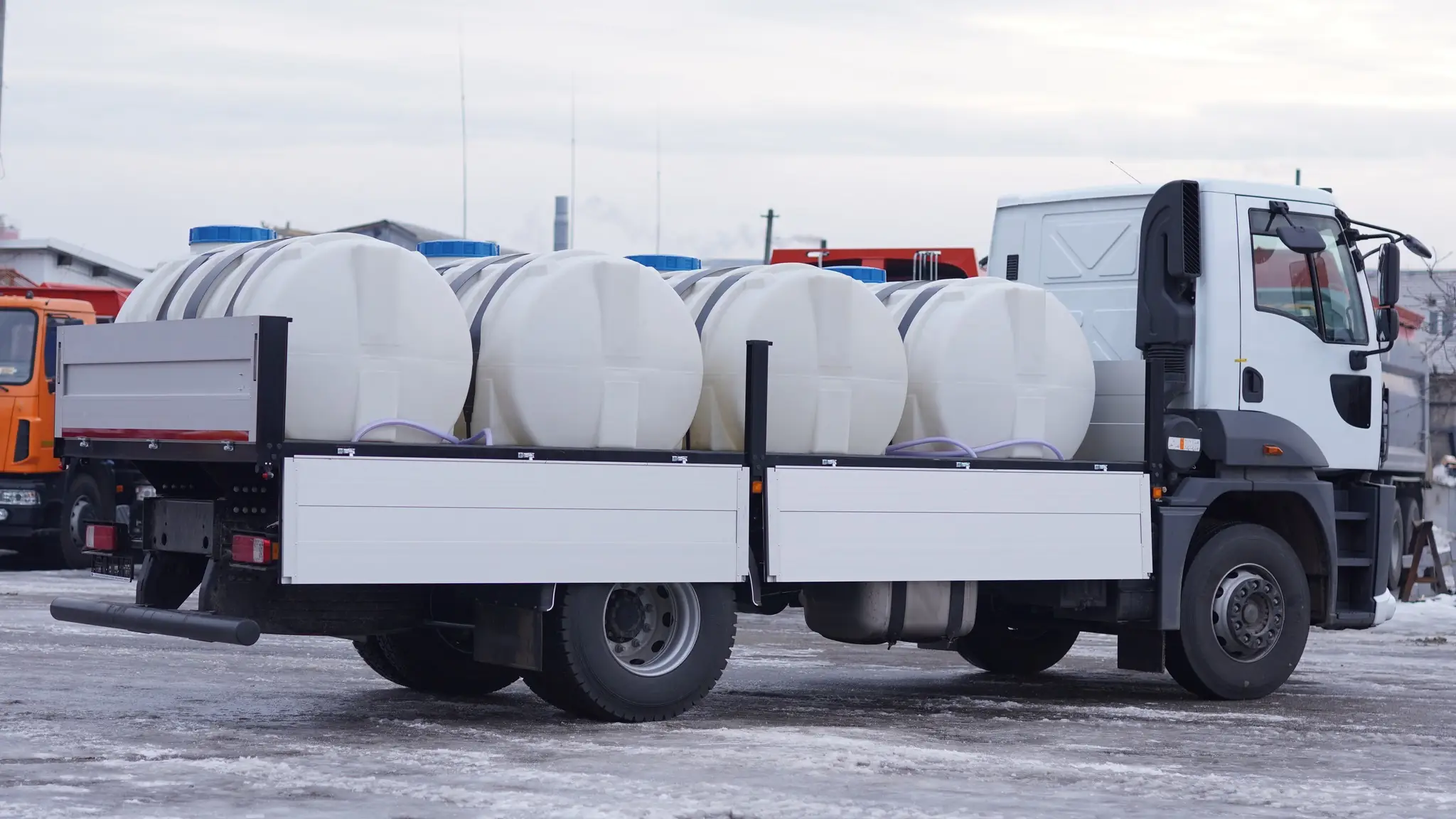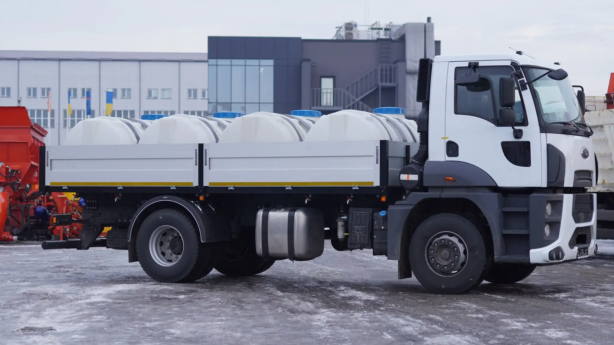 Група компаній «Будшляхмаш» виготовила спеціальний автомобіль для перевезення питної води. Такий транспорт сьогодні дуже потрібний для районів, які постраждали внаслідок теракту на Каховській ГЕС. Машина являє собою вантажівку Ford Trucks 1833DC з бортовою платформою, на яку встановлені чотири пластикові резервуари ємністю по 2 м куб. Таким чином, автомобіль може доставити одразу до 8 кубометрів води. Для видачі води є вісім дюймових кранів, змонтованих ліворуч та праворуч по борту.