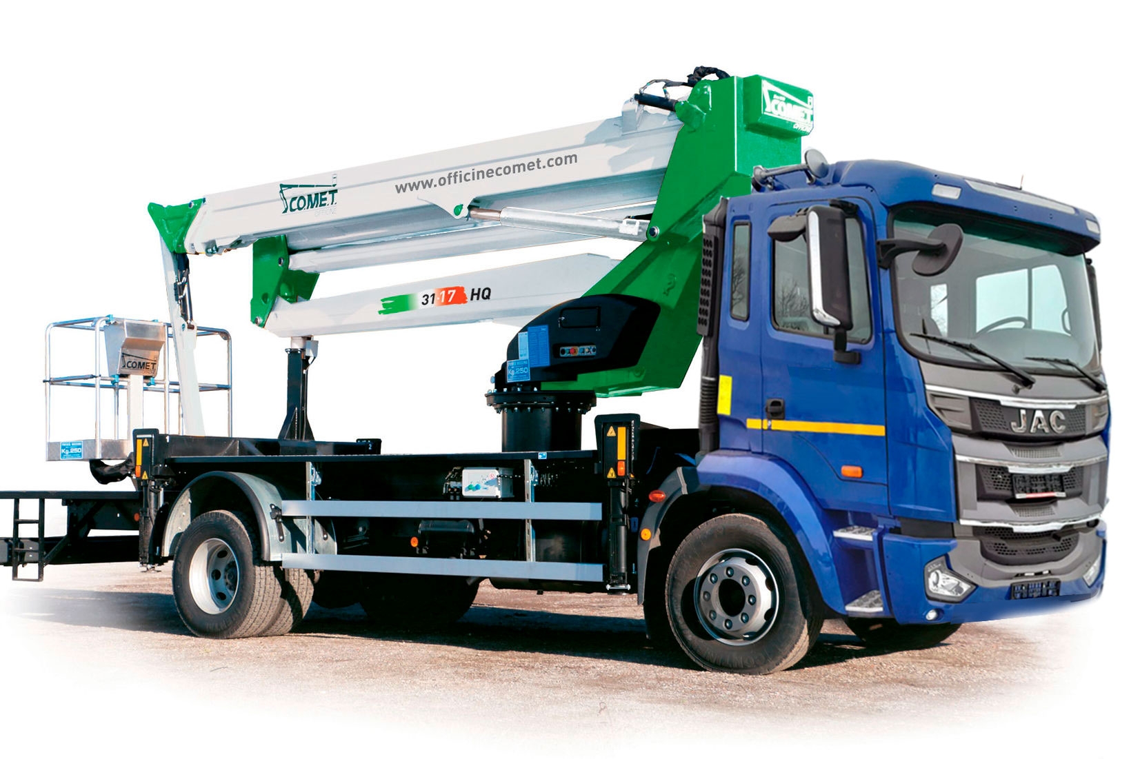 Автовишка Comet 31-2-17HQ JIB може встановлюватись на різні шасі вантажівок, розраховані на повну масу 7 т і вище. В даному випадку використано модель з солідним запасом міцності – JAC N200. Шасі має вантажопідйомність до 14 т та комплектується 6,7-літровим турбодизелем Cummins потужністю 277 r. с.