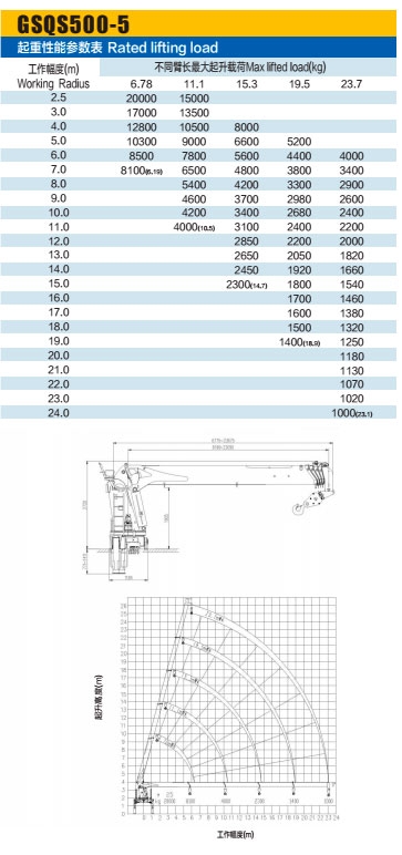 Завод спецтехніки “Техкомплект” представляє новинку на вітчизняному ринку автокранів – тросовий маніпулятор китайської марки XCMG. Модель GSQS500-5 має вражаючі характеристики – вантажопідйомність до 20 000 кг при мінімальному вильоті 2,5 м і 1000 кг — при максимальному 23 м. Докладніше з підйомними характеристиками можна ознайомитися зі схеми, показаної нижче.