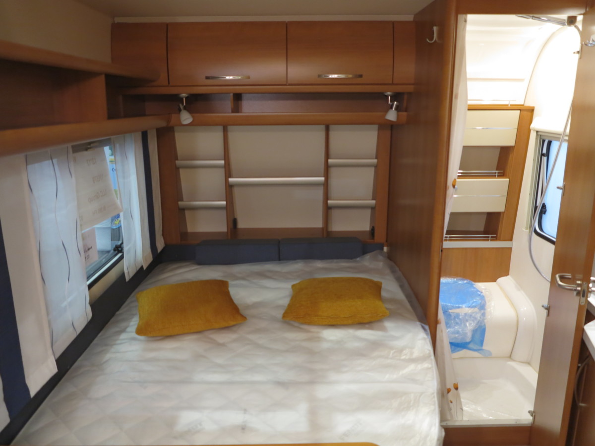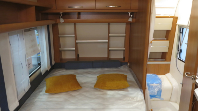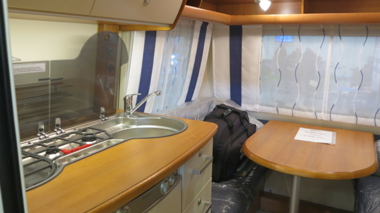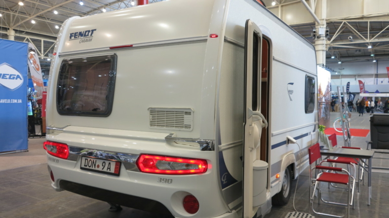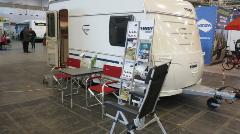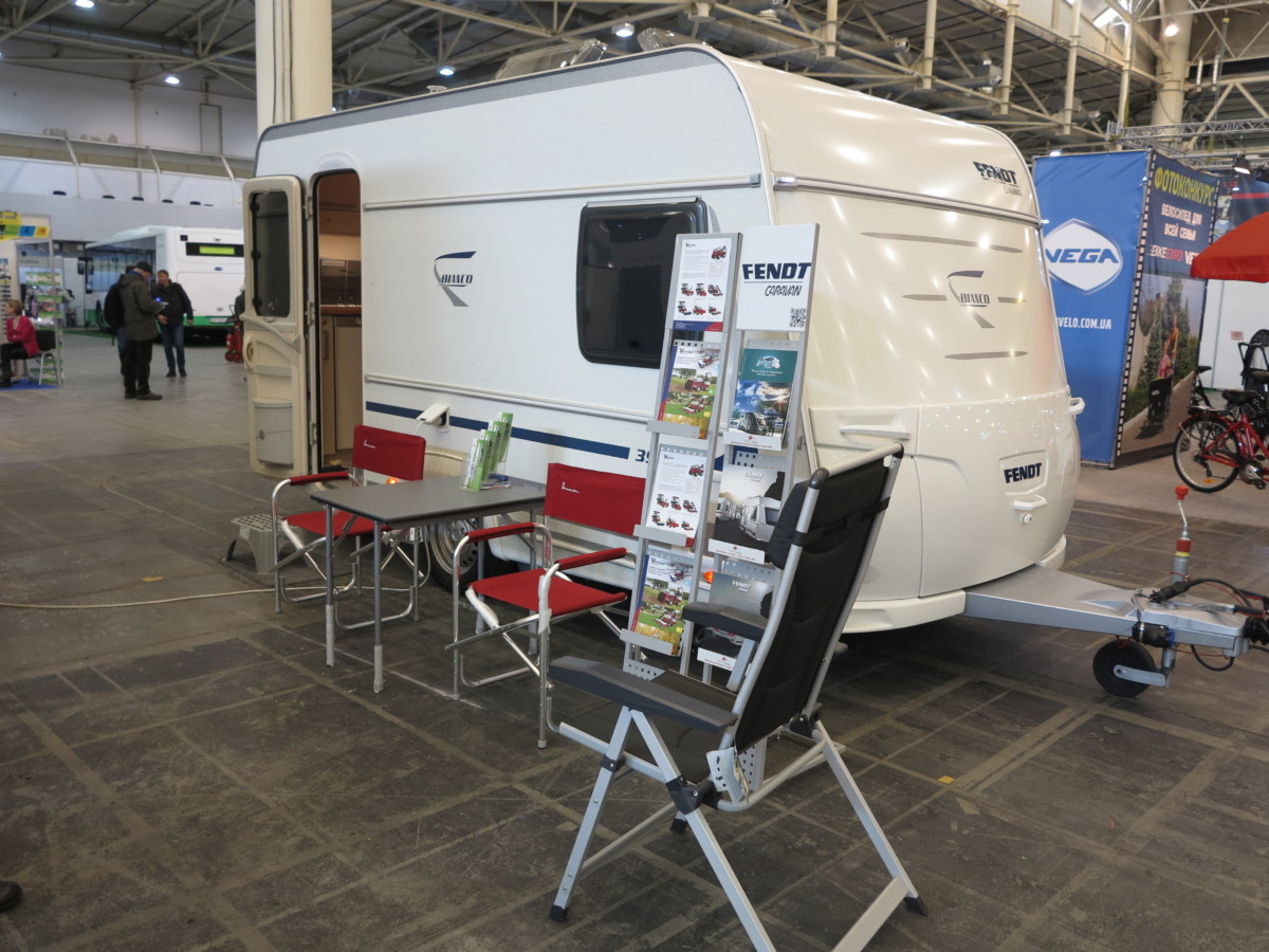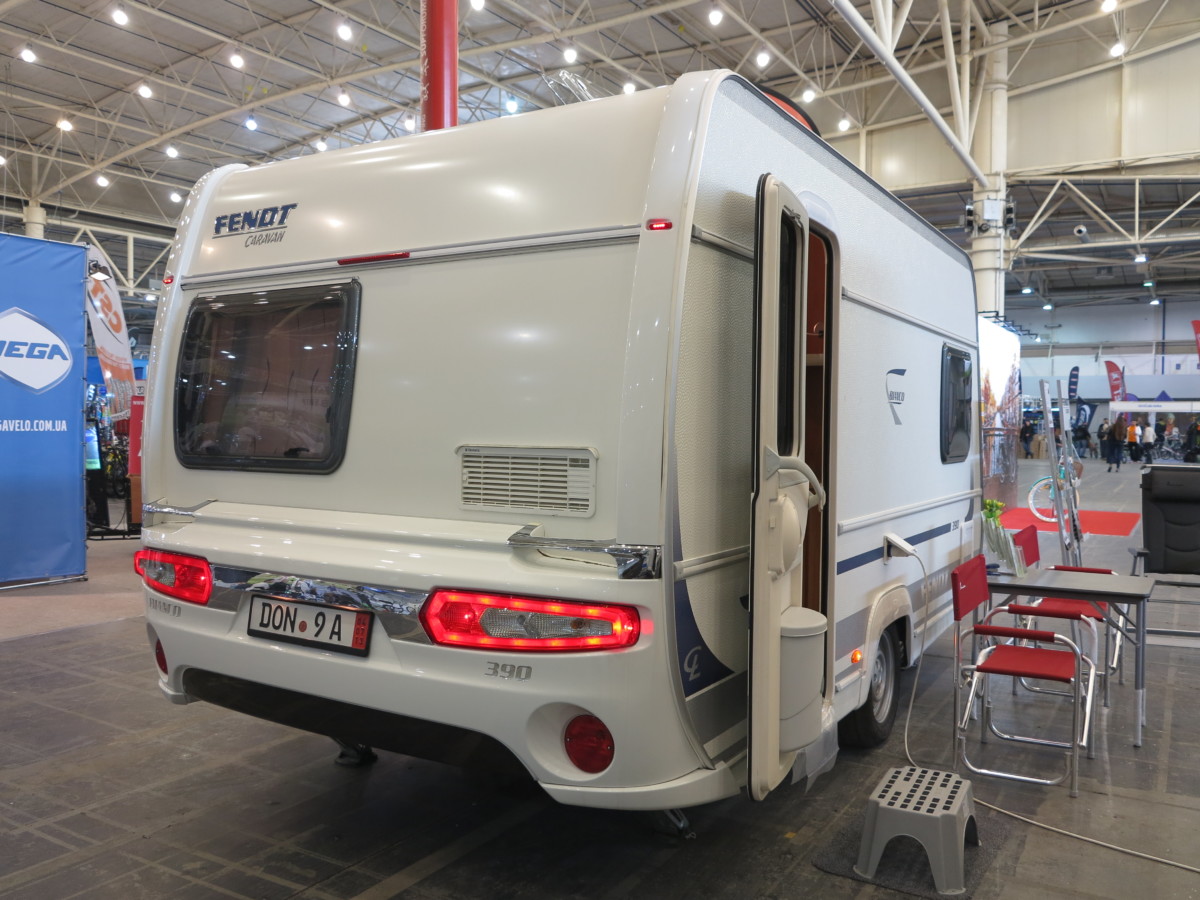 А вот официальный представитель немецких караванов Fendt Caravan экспонирует интересный кемпер модели Bianco 390 – то есть с длиной салона 3900 мм. Здесь уже есть полноценная широкая кровать, стол, кухонный блок с газовой плитой и холодильником, а также душевая кабина и биотуалет.