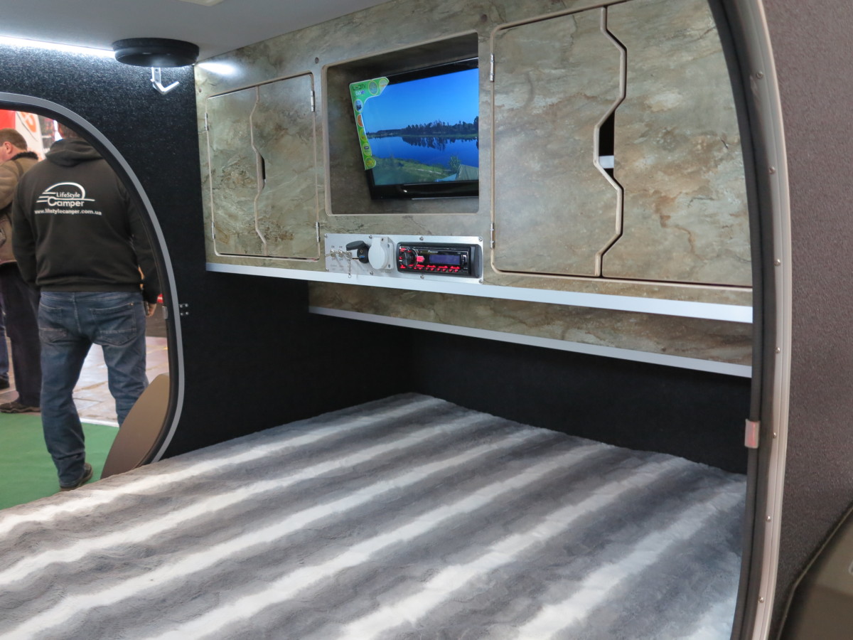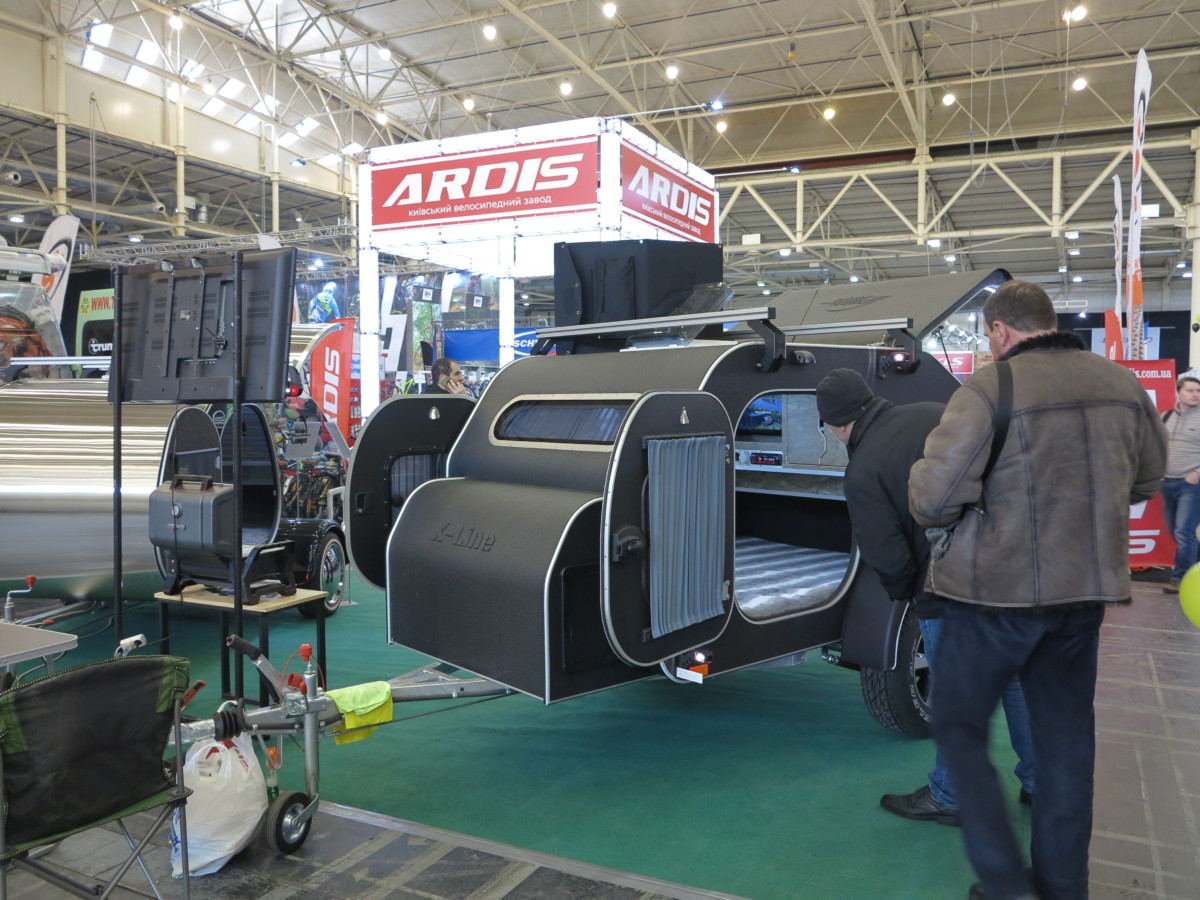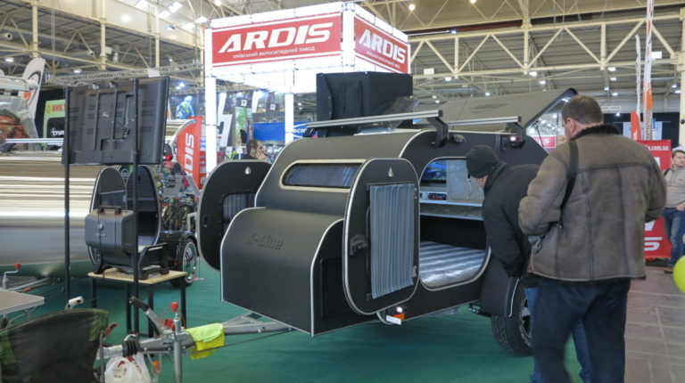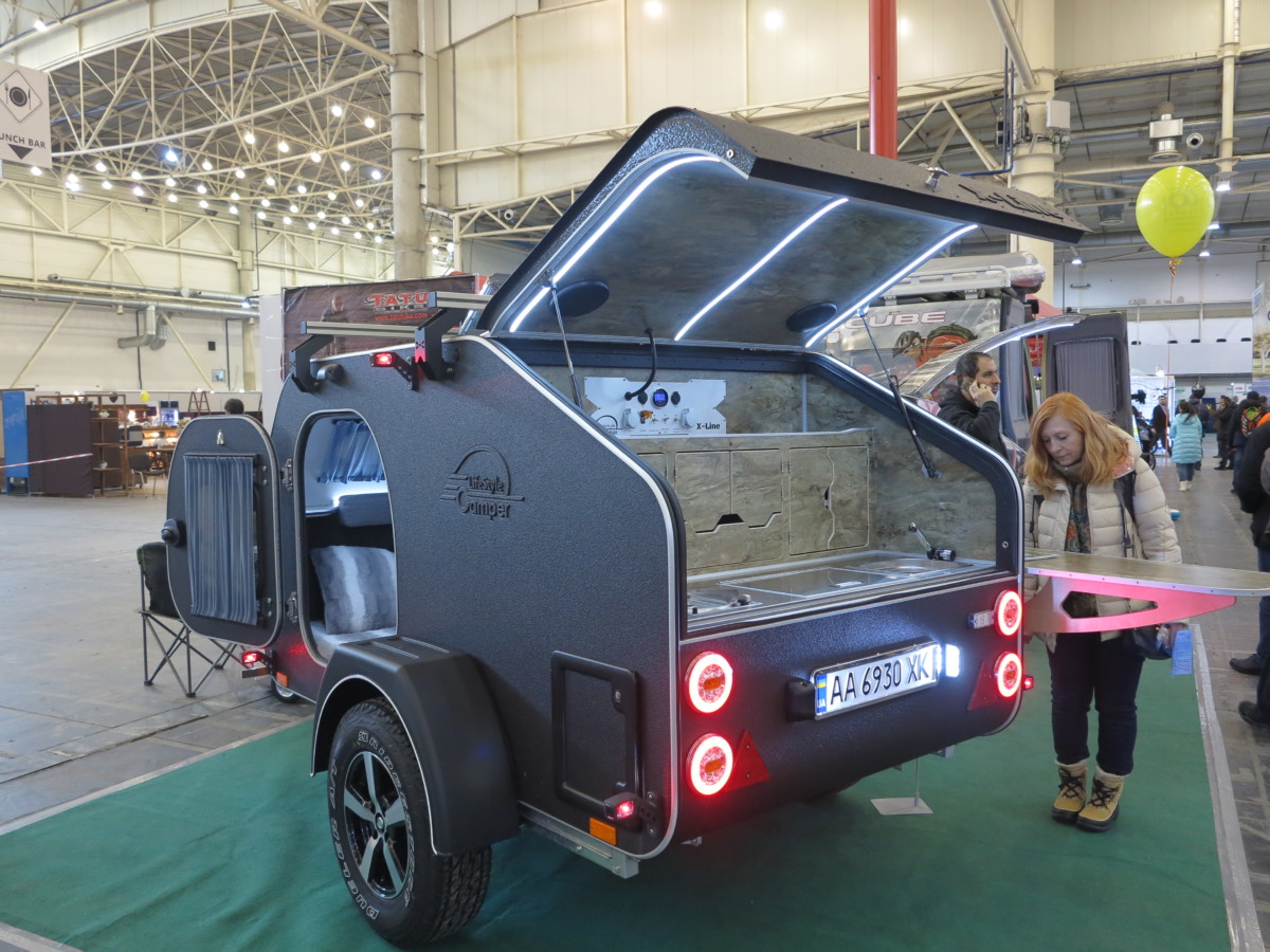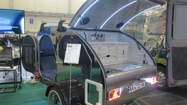 Известный украинский производитель теардроп кемперов LifeStyle Camper – компактных, с кузовом каплеобразной формы привез на выставку в МВЦ сразу две модели. Первая это классическая, с отполированными до зеркального блеска бортами.