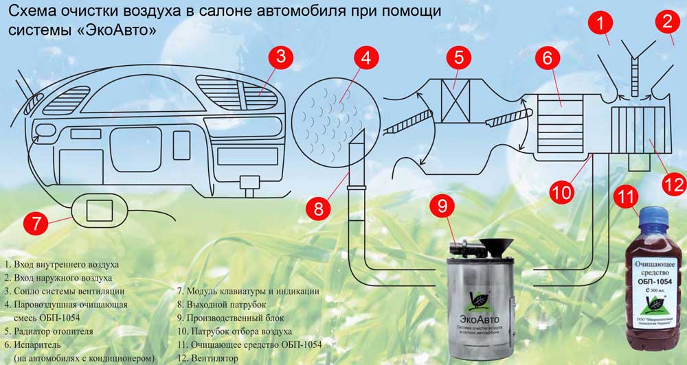 Принцип технологии очистки воздуха в салоне автомобиля следующий. В воздуховод приточной вентиляции подается паровоздушная смесь очищающего биоразлагаемого средства ОБП-1054. Поступление ее управляется автоматически, по заданной программе. Система монтируется в легковом автомобиле под передней панелью и не нарушает стиля интерьера. Для управления служит простенький модуль с двумя кнопками – включения и выбора режима интенсивности работы.