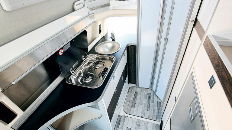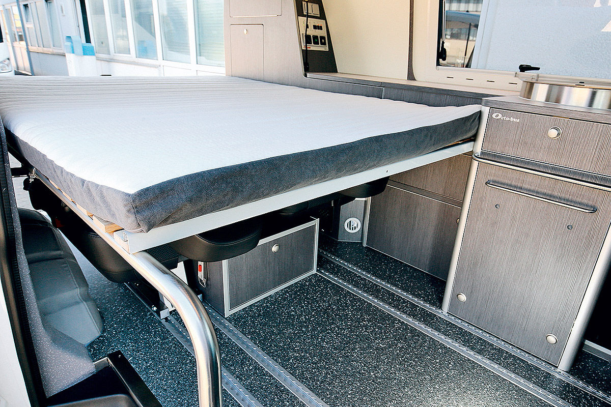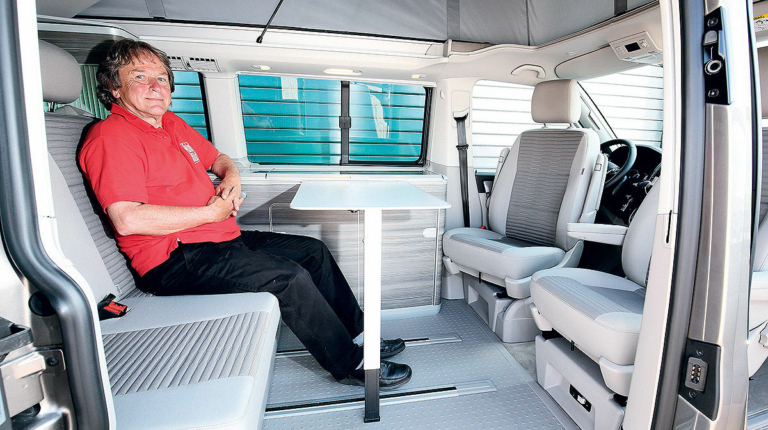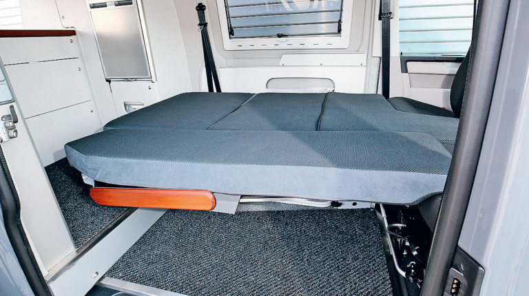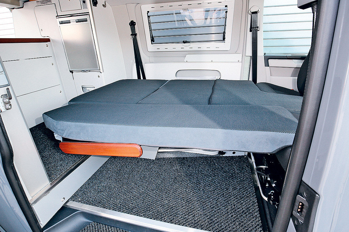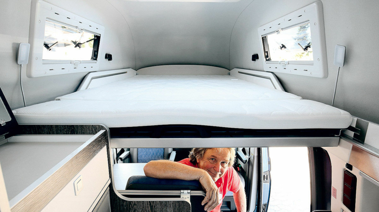 Крісла трансформуються в двоспальне ліжко, з додатковим валиком в головах. З особливостей – висувний намет на даху з переднім входом, отримує міні тераса. Це найдорожчий кемпер в порівняльному тесті – 64 956 євро.