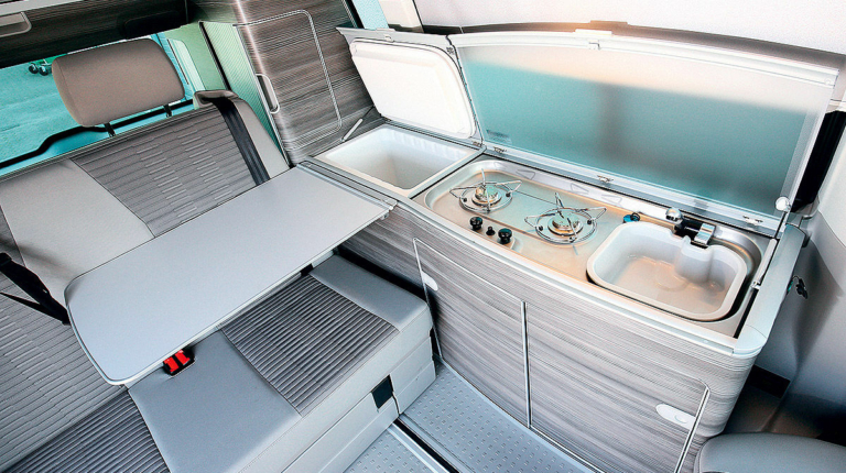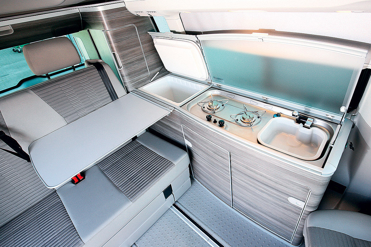 І, нарешті, на закуску порівняльного тесту – кемпер Сalifornia від самого Volkswagen. Тому заводська гарантія надається на все обладнання. Тут багато різних опцій. Так, наприклад, висувний намет на даху з електроприводом. У салоні дуже раціональне планування. Чого вартий кухонний блок з надставними столиком на рейках – для приготування їжі. Душ, щоправда, виносний.