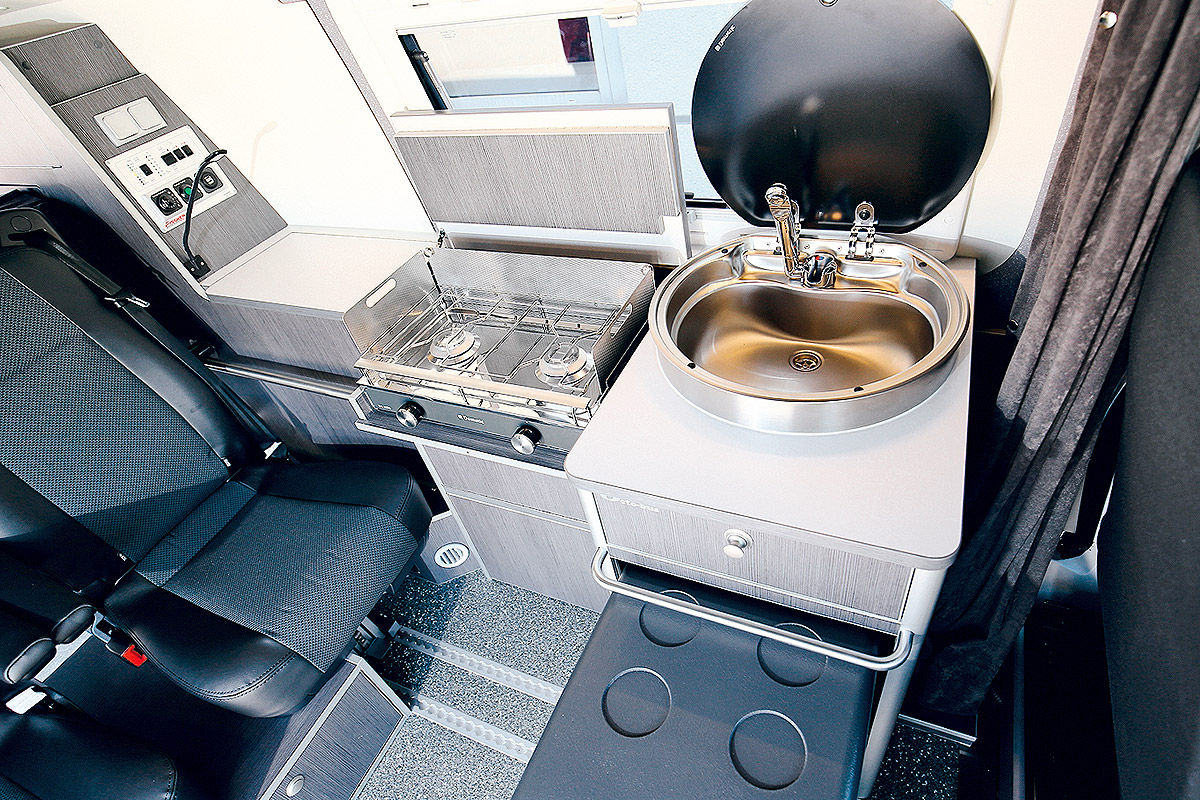 Другі зсувні дверцята, що зліва по борту, дають змогу користуватися кухонним блоком, перебуваючи на вулиці. Над сидіннями можна розкласти двоспальне ліжко, ще одне ліжко на двох – у наметі на даху. У передній частині намету за доплату встановлюється відкидний люк (на фото). Terracamper найдоступніший з тестованих – його ціна від 45 900 євро.
