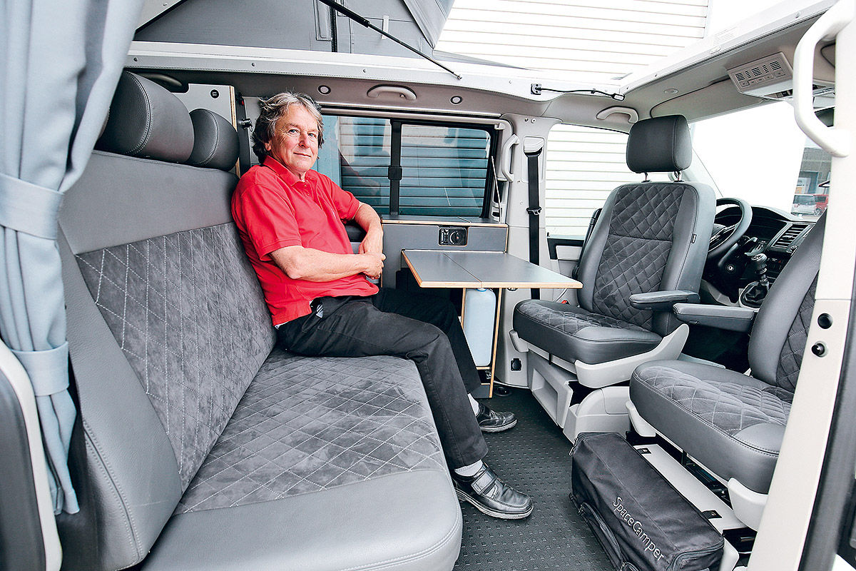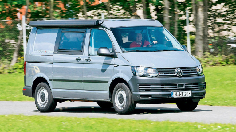 Перший на тесті – кемпер від фірми Сampmobil з німецького міста Шверін. Тут є все для відпочинку і ночівлі чотирьох осіб. Це трансформоване із сидінь двоспальне ліжко внизу і ще одне двоспальне ліжко – у розкладному наметі на даху. Є кухня, 2 баки по 19 л для води, холодильник об’ємом 45 л і висувний біотуалет. Столик має розкладну секцію, а передні крісла виконані поворотними, що дає змогу з комфортом розміститься вчотирьох. Машина оснащена турбодизелем 2,0 TDI 102 к.с. Ціна базового Сampmobil – 52 590 євро.