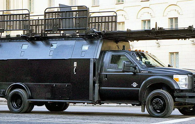 Второй автомобиль выглядит просто монстром – это комплекс «Марс» для спецподразделений, изготовленный на шасси длиннобазного Ford F-550. Машина имеет бронированные кабину и бронированную надстройку для спецназовцев - с бойницами по бортам. Самое интересное находится на крыше – это большой металлический трам, по которому штурмовой отряд может проникать на высоко расположенные объекты на уровне второго этажа.