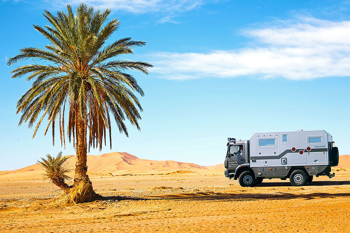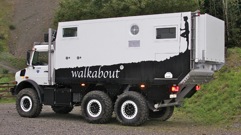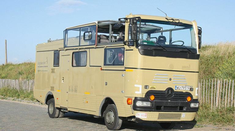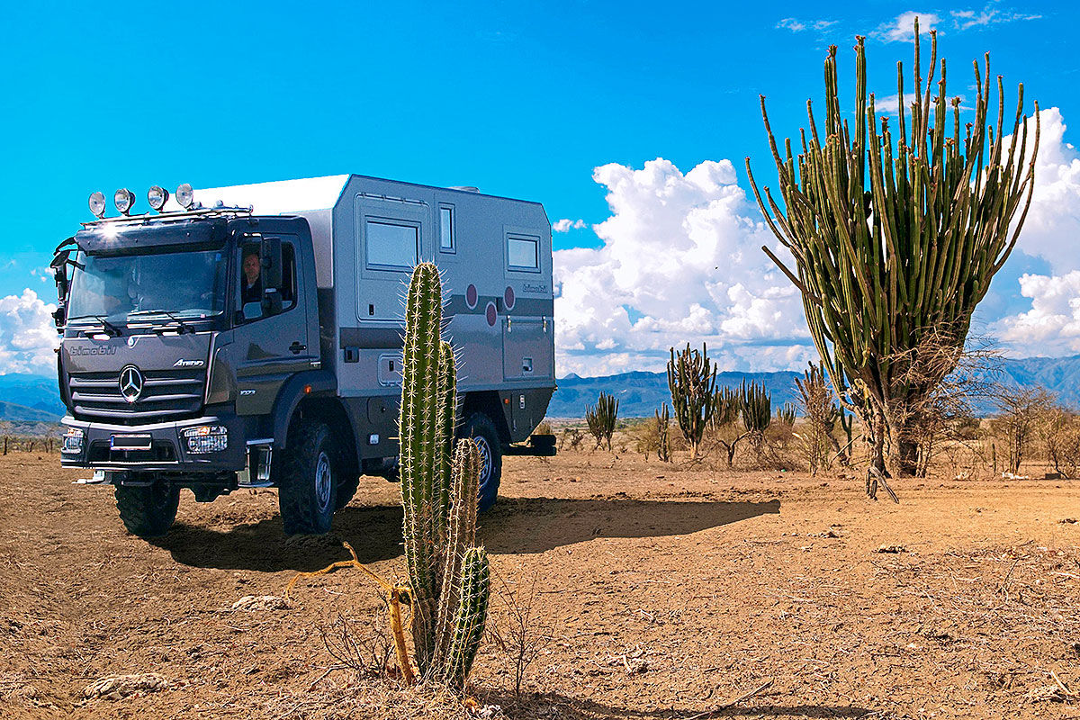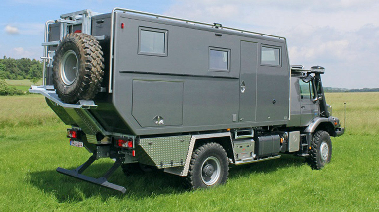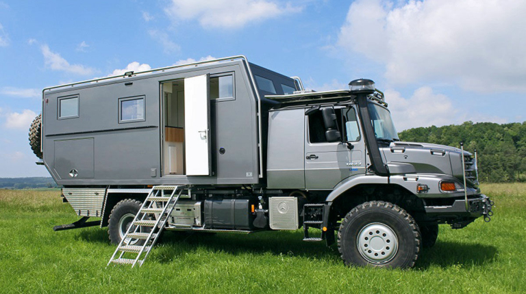 Не менее интересные кемперы изготавливает немецкое ателье Woelcke. Так, заслуживает внимание его модель на базе тяжелого трехосного внедорожного грузовика Mercedes-Benz Zetros 1833 (4х4)