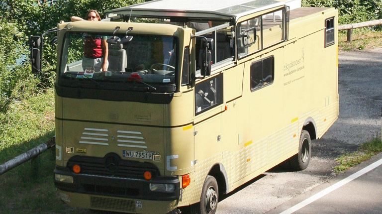 Еще один необычный кемпер, только уже на более тяжелом шасси c трехлучевой звездой – на базе грузовика Mercedes-Benz Atego 2003 года, представило немецкое ателье Skydancer. Машина была засвечена на салоне караванинга в Дюссельдорфе в 2014 году. Его особенность в том, что водитель и пассажиры сидят высоко над двигателем, на втором этаже, а спальный отсек расположен под ними, на первом этаже.
