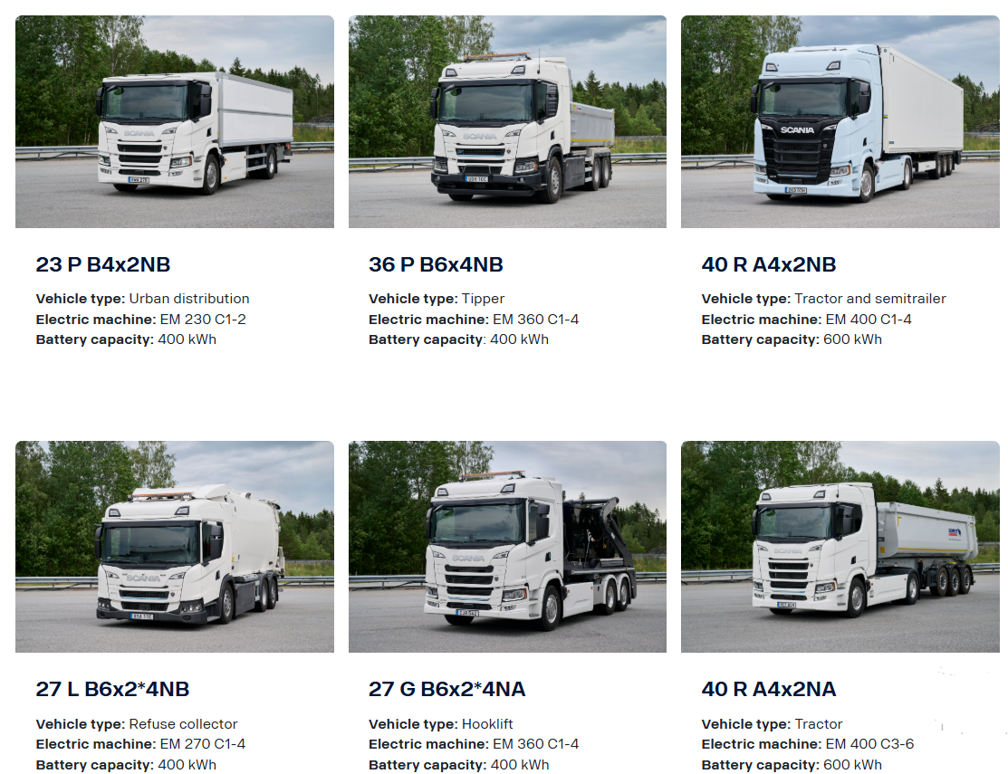 Це магістральний сідельний тягач із напівпричепом – моделі 40 R (4х2) з електричною установкою EM 400 та акумуляторами ємністю 600 кВт.год. Сідельний тягач 40 R (4х2) із самоскидним напівпричепом – з аналогічними характеристиками. Це також машина 36 P (6х2) з самоскидним кузовом та вантажівка з гаковим навантажувачем – 27 G (6Х2) – обидві оснащені електромотором EM 360 та батареями 400 кВт. У роуд-шоу беруть участь ще й модель 23 P (4х2) з розвізним фургоном – EM 230 і 400 кВт.