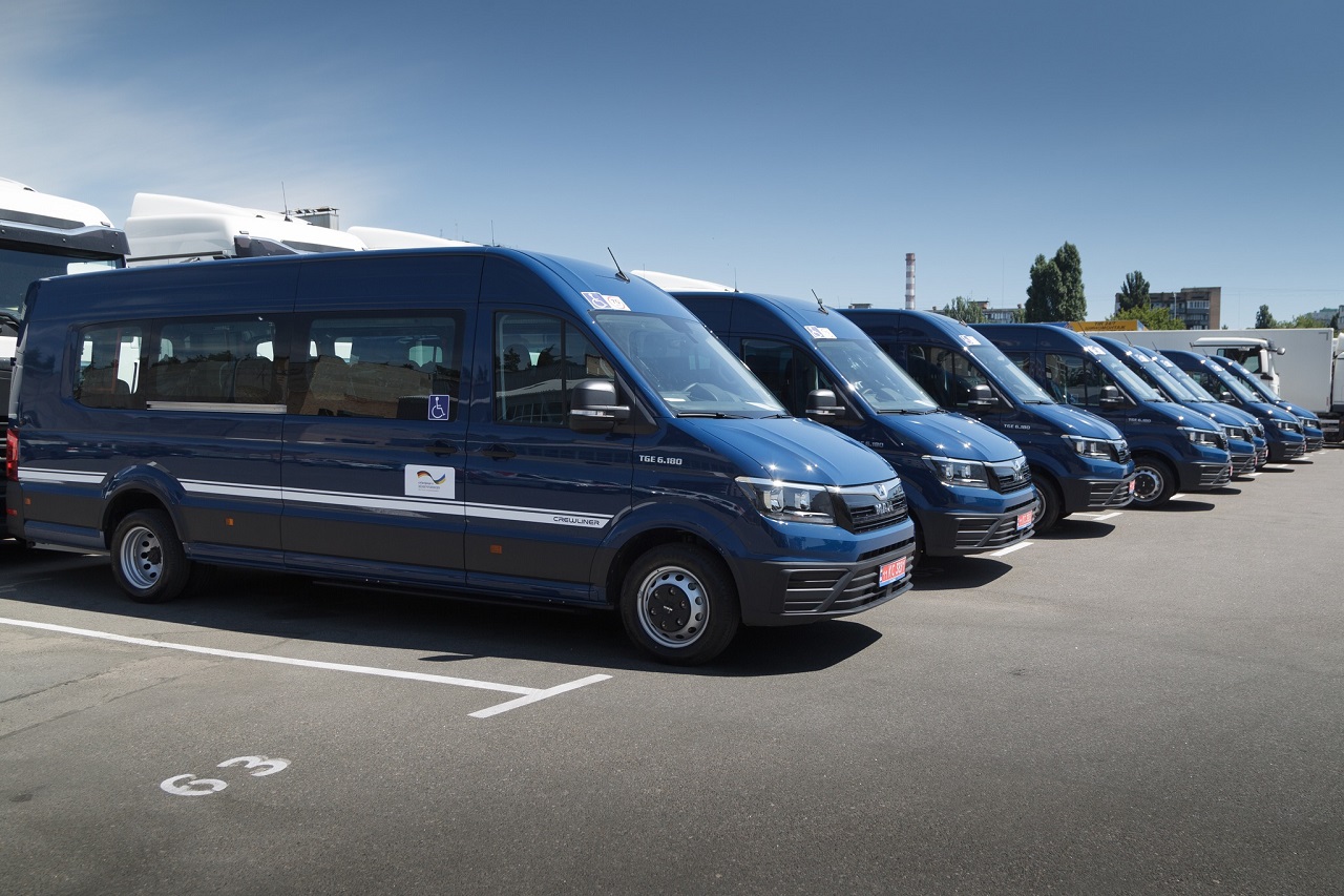Автомобілі придбало Німецьке товариство міжнародного співробітництва (GIZ) в рамках «Спеціальної програми підтримки України» EU4Resilient Regions. Мікроавтобуси MAN TGE 6.180 поставлені офіційним імпортером “МАН Трак енд Бас Юкрейн”. Машини у виконанні Crewline, з довгою базою та високою кришою, обладнані спеціальними гідроліфтами, мають зсувні двері з обох боків та оптимально підходять для перевезення маломобільних громадян.