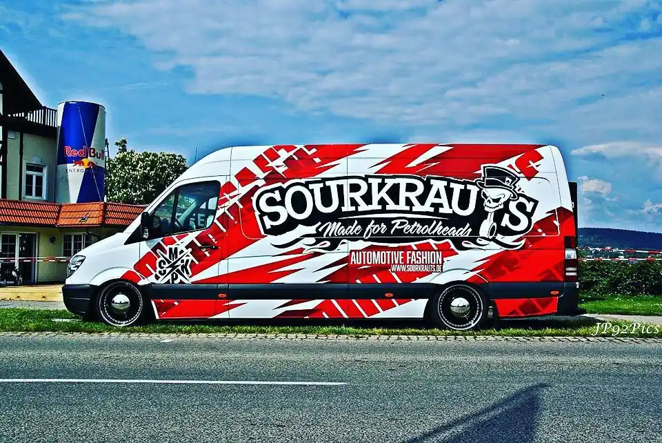 С виду этот развозной фургон Mercedes-Benz Sprinter привлекает внимание необычным окрасом и низкоопущенным кузовом на низкопрофильной резине. Данный автомобиль работает по доставке одежды для автомобильных фанов, под брендом Sourkrauts.
