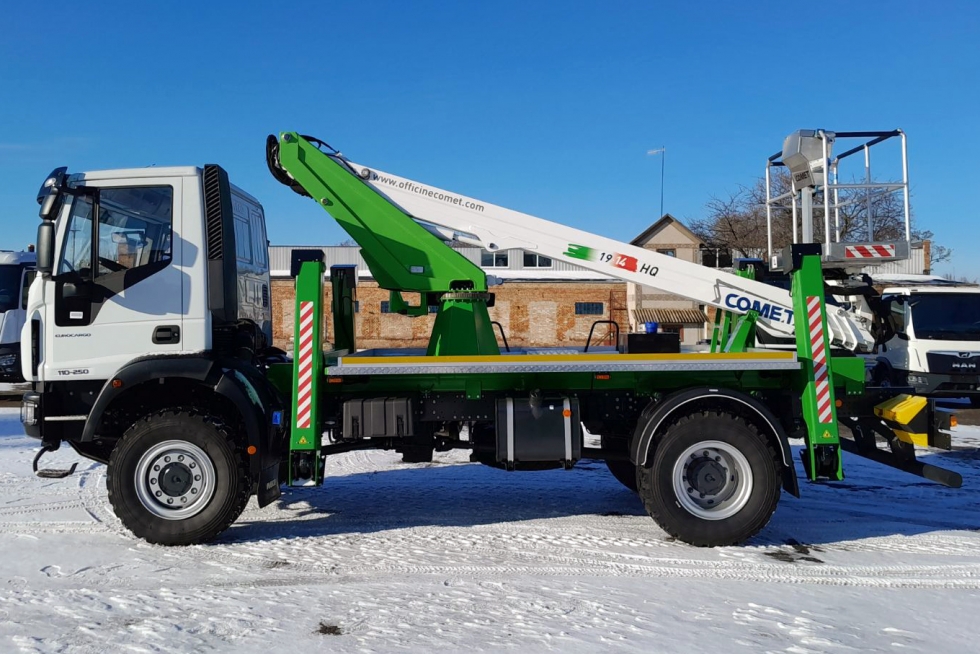 Відзначимо, що автогідропідйомник Comet 19-2-14HQ завдяки невеликій власній вазі може встановлюватися на шасі автомобілів повною масою всього від 3,5 т. Що ж до позашляхового шасі IVECO EuroCargo ML110-250, то воно зроблено з солідним запасом міцності й розраховане на повну масу 11,5 т та вантажопідйомність 5,81 т. Тут встановлено 6-циліндровий турбодизель Tector робочим об’ємом 5,9 л та потужністю 250 к. с., що працює в парі з механічною 6-ступеневою коробкою передач марки ZF. Застосовується тримісна комфортабельна кабіна.