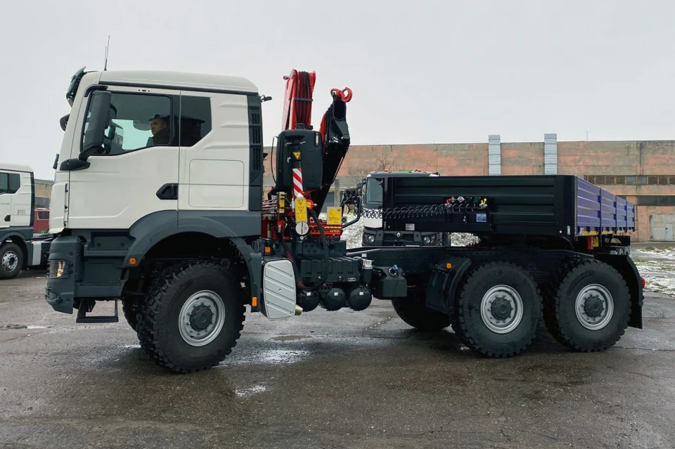 Тягач MAN TGS 33.480 (6х6) укомплектований 480-сильним турбодмзилем D28 та 400-літровим баком. Сідельно-зчіпний пристрій розрахований на навантаження 10,5 т.