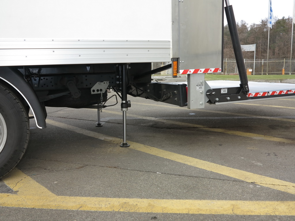 Враховуючи коротку колісну базу і довге заднє світло автомобіля, ми встановили висувні гідравлічні опори, що стабілізують машину при навантаженні-розвантаженні. Компанія Dhollandia виробляє вертикальні гідроборти різних типів, які можуть використовуватися і в агросекторі, наприклад, для доставки худоби. Вертикальні гідроборти незамінні при багаторівневому розміщенні вантажу у фургоні, що дає змогу максимально використовувати його корисний об’єм.