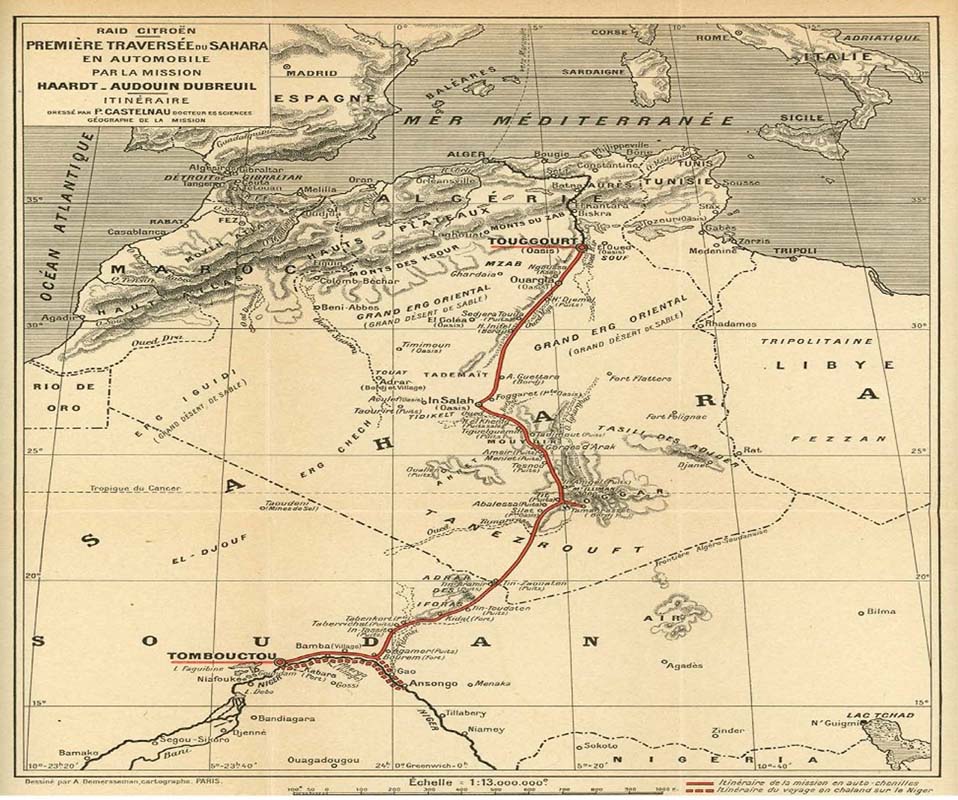 Експедицію очолили відставний полковник Луї Одуен Дюпрей, який добре знав умови Африки, та генеральний керуючий заводами Citroen – Жорж Марі Хаардт. Колона стартувала із Тугурту. Середня швидкість маршруті становила 15 – 18 км/год. При цьому середня витрата палива була 28 л на 100 км. 7 січня машини прибули до Тимбукту. На фініші їх зустрічали сам Андре Сітроен та Адольф Кегресс. А 1 лютого машини вирушили у зворотну путь.