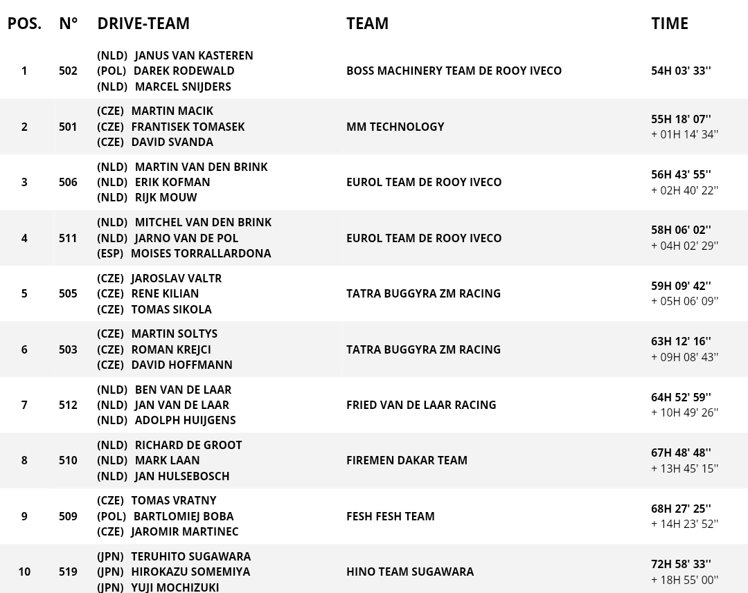 У своєму четвертому ралі Дакар Янус ван Кастерен-молодший скористався своїм досвідом, щоб показати стабільний виступ, завоювавши кілька подіумів і перше місце у фінальному заліку. За ним пішов гонщик-ветеран і легенда Дакара Мартін ван ден Брінк, який посів третє місце. Його син і товариш Мітчел ван ден Брінк провів вражаючу гонку, завоювавши кілька других місць і став наймолодшим переможцем, посівши перше місце на 6-му етапі та завершивши змагання у четвертому місці.