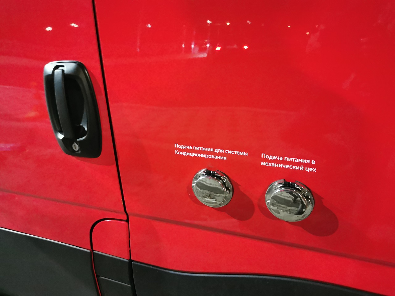 Зовні цей спеціалізований фургон IVECO Daily виділяється наявністю кондиціонера на даху вантажного відсіку, а також двома роз’ємам на лівому борту зовні, відразу за дверима водія. На одному роз’ємі написано “Подача живлення для системи кондиціювання”, а на другому – “Подача живлення до механічного цеху”.