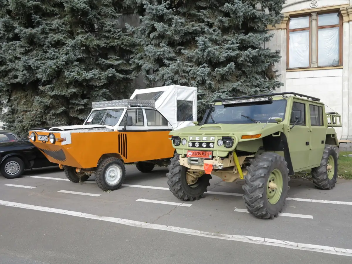 Начнем с амфибии, в основу которой положен УАЗ-469. Правда, от внедорожника осталась лишь ходовая и лобовое стекло. А вот водоплавающий кузов был разработан с нуля и построен одним киевским умельцем. Постройка машины датирована 1980 годом, хотя ее в последствии не раз дорабатывали – сын перенял эстафету отца.