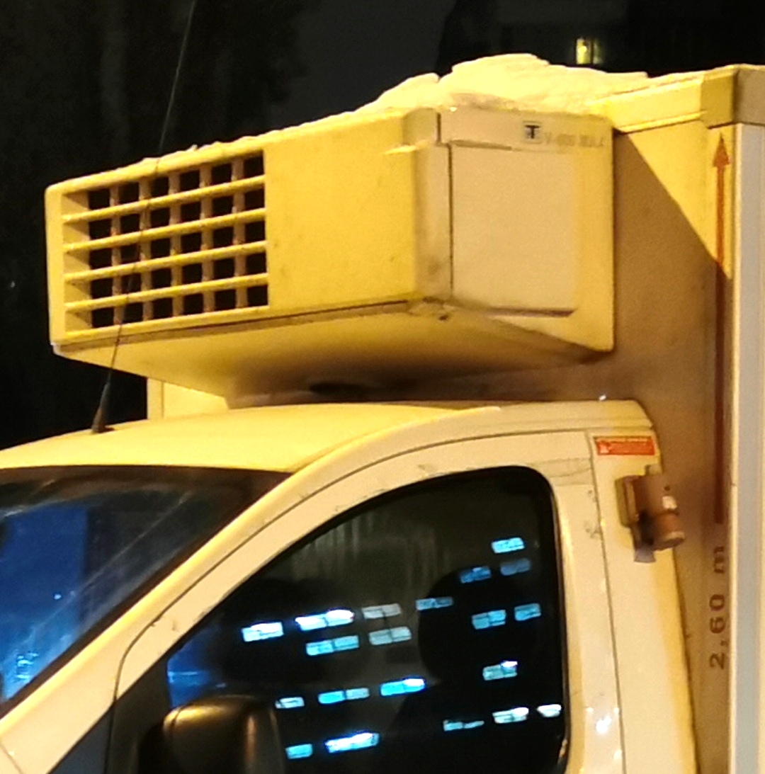 А ось на передній стінці надбудови, над кабіною водія розташований холодильний агрегат марки Termo King. Цікаво, що останній на стоянці можна підключати до мережі 220В – для цього встановлений відповідний роз’єм позаду водійських дверей. Габаритна висота автомобіля становить 2,60 м, про що свідчить відповідний напис зі стрілкою відразу за кабіною.