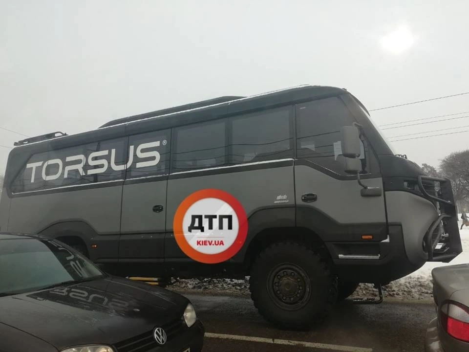 Сфотографированный же на Борщаговке темно-серый автобус перевозил даже дипломатов в Киеве. Машина привлекает внимание не только ярким дизайном, но и феноменальной геометрией проходимости.
