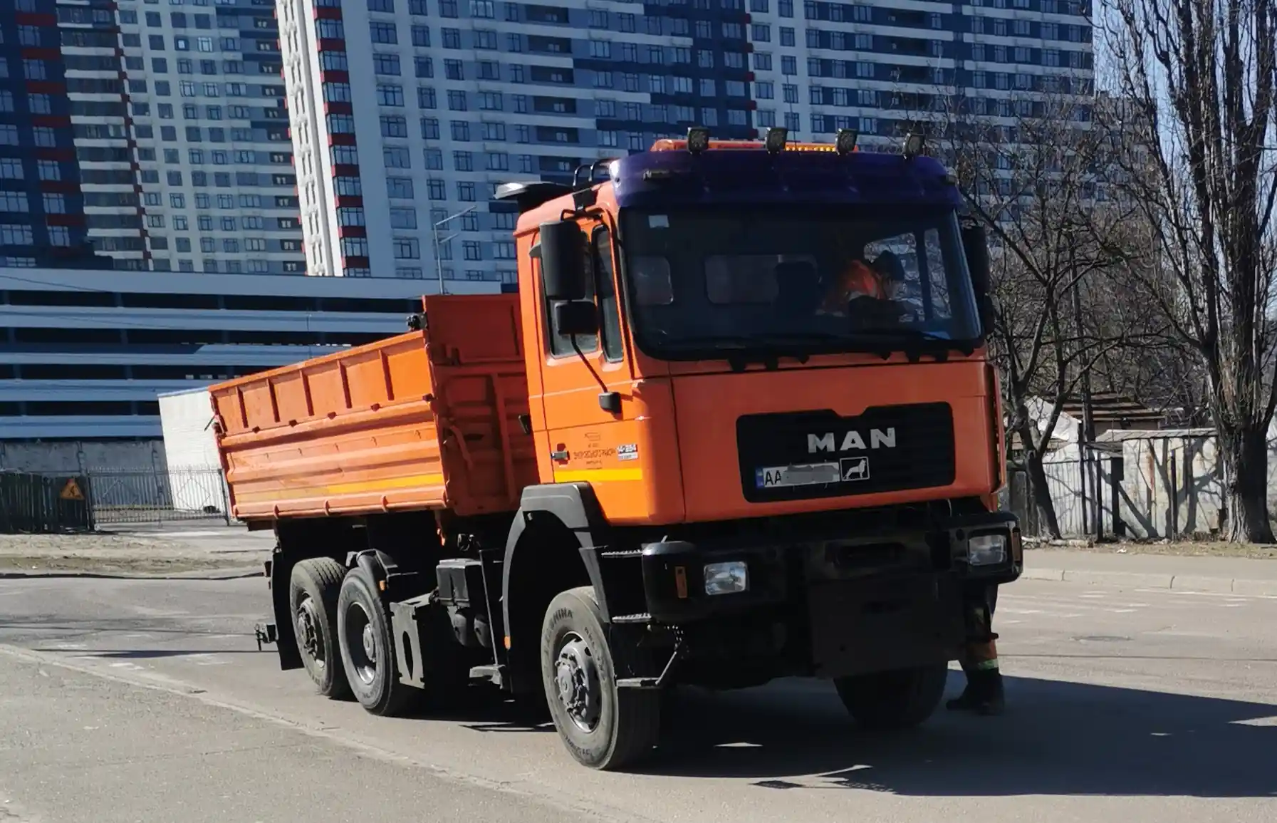 А ось ще один самоскид, MAN 14.264, який має колісну формулу 6х2 – із третьою непровідною віссю. Цього разу вона піднята. Це покращує маневреність та знижує витрату палива та знос шин у ненавантаженому стані. Модель розрахована на повну масу 14 т та укомплектована 6,8-літровим дизелем у 260 к.с.