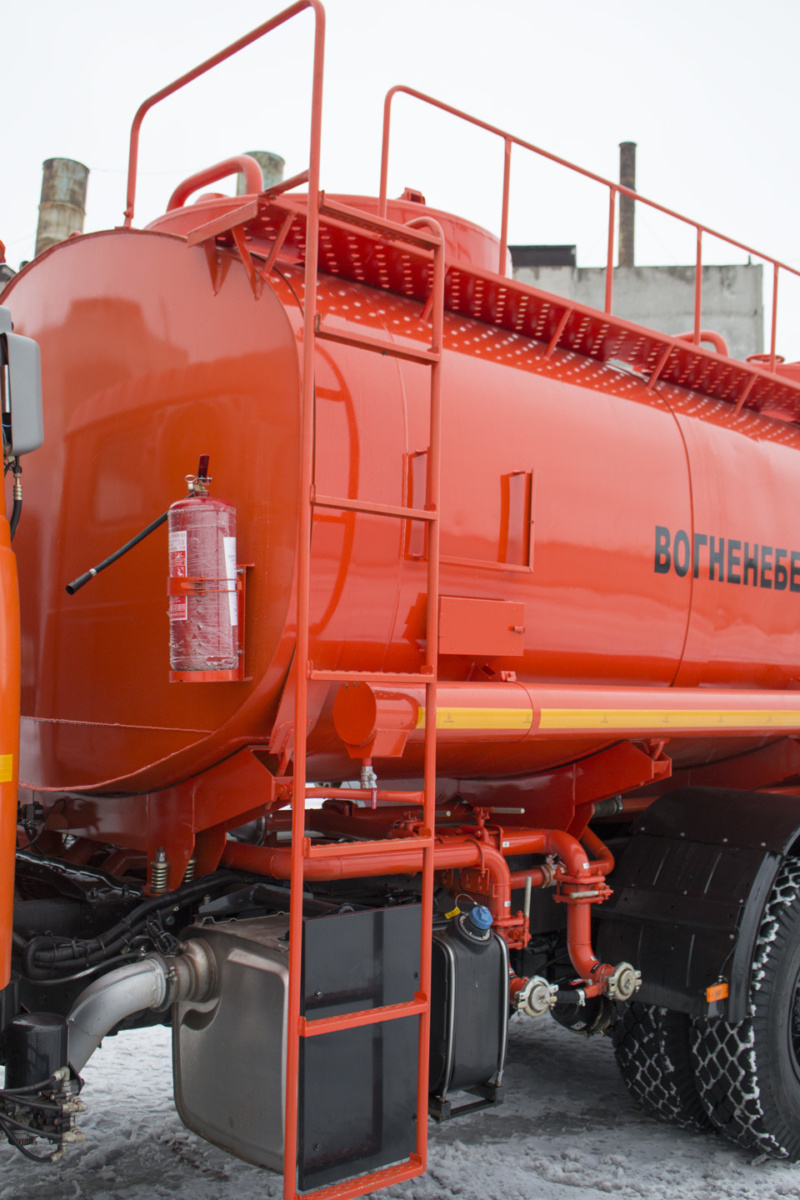 Двухсекционная цистерна производства ГП «45 ЕМЗ» (г. Винница) изготовлена из стали толщиной 6 мм, оборудована горловинами (диаметр смотровой люка 500 мм), ребрами жесткости, стационарной лестнице, дышащим устройством, сигнализатором наполнения и прочим. Насос подает жидкость 500 л / мин, высота всасывания – 4,5 м, в боковых пеналах есть два напорно-всасывающих рукава 75 мм и длиной 4 м и многое другое.