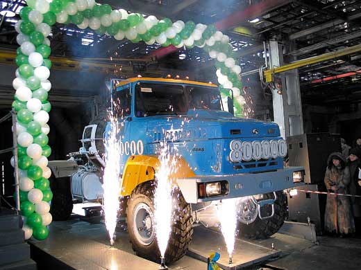 | Год своего 60-летия ХК «АвтоКрАЗ» отметил выпуском юбилейного, 800-тысячного автомобиля. Седельный тягач КрАЗ-6446 сошел с главного конвейера предприятия 27 января. В сборочном цехе на торжественный митинг, посвященный этому празднику, собралось около пяти тысяч автозаводцев и гостей. |
