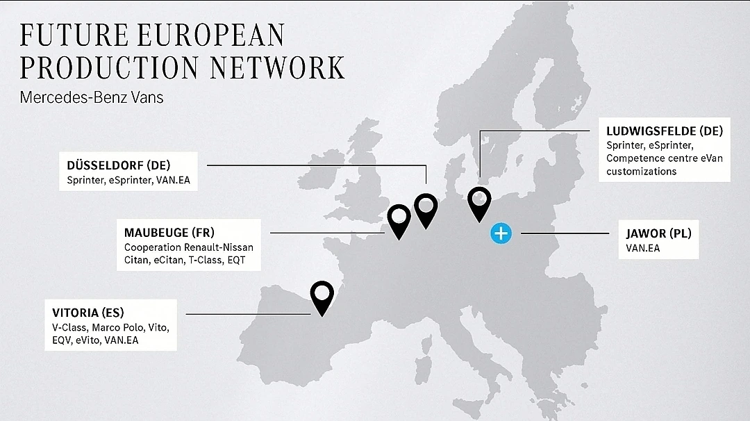 Сьогодні Mercedes-Benz Vans має у своєму розпорядженні три підприємства в Німеччині та Іспанії. Так, у Дюссельдорфі випускають моделі Sprinter і eSprinter (з другої половини 2023 року почнеться випуск електричної моделі наступного покоління). У Людвігсфельді з 2018 року виробляють шасі Sprinter під різні кузови, а з весни 2024 року до них додадуться і машини eSprinter. Що ж стосується іспанського підприємства у Віторії, то тут виготовляють середньорозмірні моделі: V-Class, EQV, а також Vito/eVito, включаючи пасажирські версії Tourer.