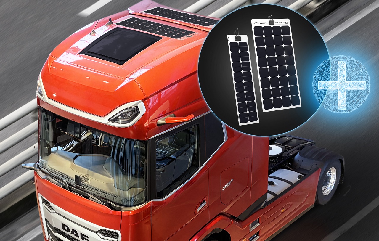 Підвищення паливної економічності – завжди актуальна тема для власників вантажівок. Підрозділ PACCAR Parts представляє тут досить дієве рішення – гнучкі сонячні панелі для установки на дах кабіни і кузова вантажівки, а також причіпної техніки. Панелі пропонуються у двох типорозмірах. Менший з них має товщину всього 3 мм, довжину 110 см та ширину 30 см, важить 700 грам та забезпечує потужність 55 Wp (Ватт-пік). Другий типорозмір, удвічі більший, важить 1,3 кг та має потужність 110 Wp. На дах вантажівки можна спокійно встановити відразу обидві панелі різних розмірів, які видаватимуть 165 Wp, що дорівнює 135 Вт.