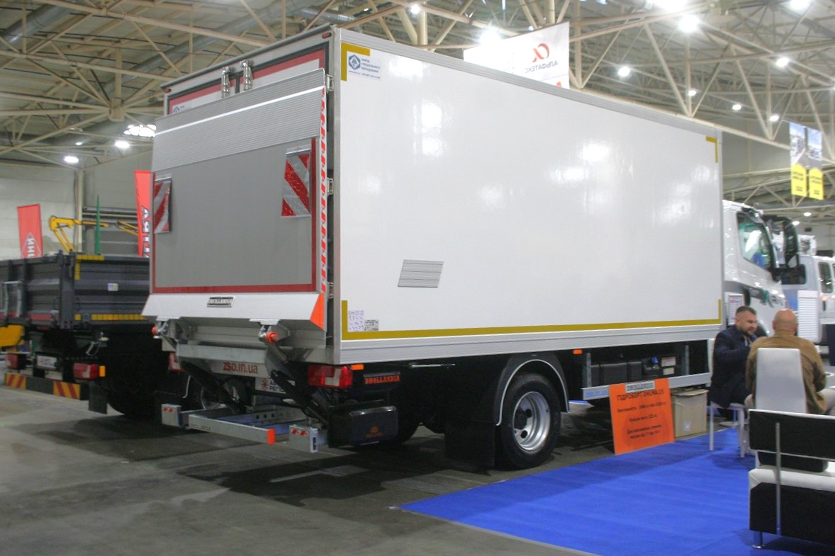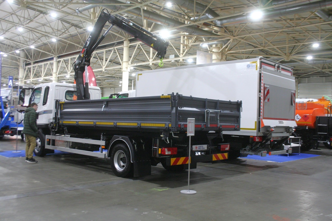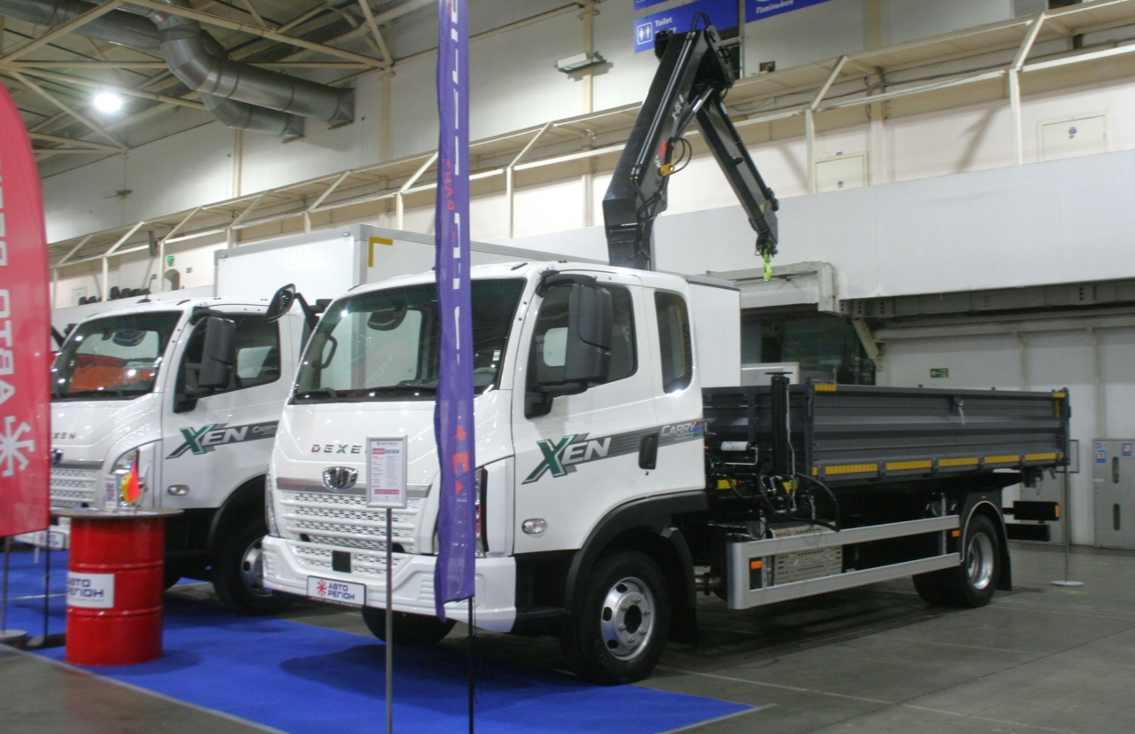 На стенді модель Dexen була представлена в трьох варіантах – з різними кузовними надбудовами. Це самоскид тристороннього розвантаження, зі сталевою платформою (товщина стінок – 3 мм, підлоги – 4 мм). Між кабіною та кузовом встановлений кран-маніпулятор шведської марки HIAB. При вильоті стріли 3,5 м вантажопідйомність складає близько двох тонн, що достатньо для навантаження труб та бетонних колодязів. Максимальний виліт сягає 7,5 м. Вантажопідйомність самоскида з КМУ становить близько 4 т.