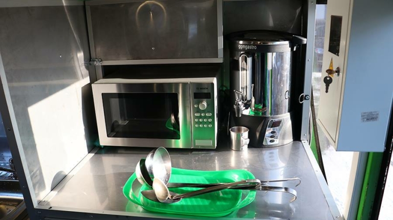 Місця для вживання їжі є як всередині автобуса, так і зовні – для цього передбачені виносні лавки і столи. Від негоди захистить великий тканинний розбірний дах, т.зв. «маркіза». В результаті автобус-їдальня може одночасно обслуговувати до 54 військовослужбовців.