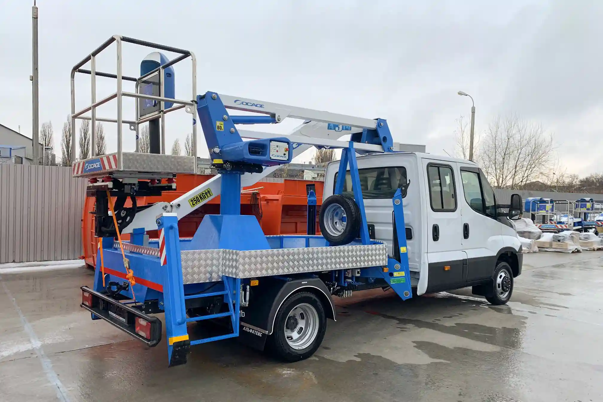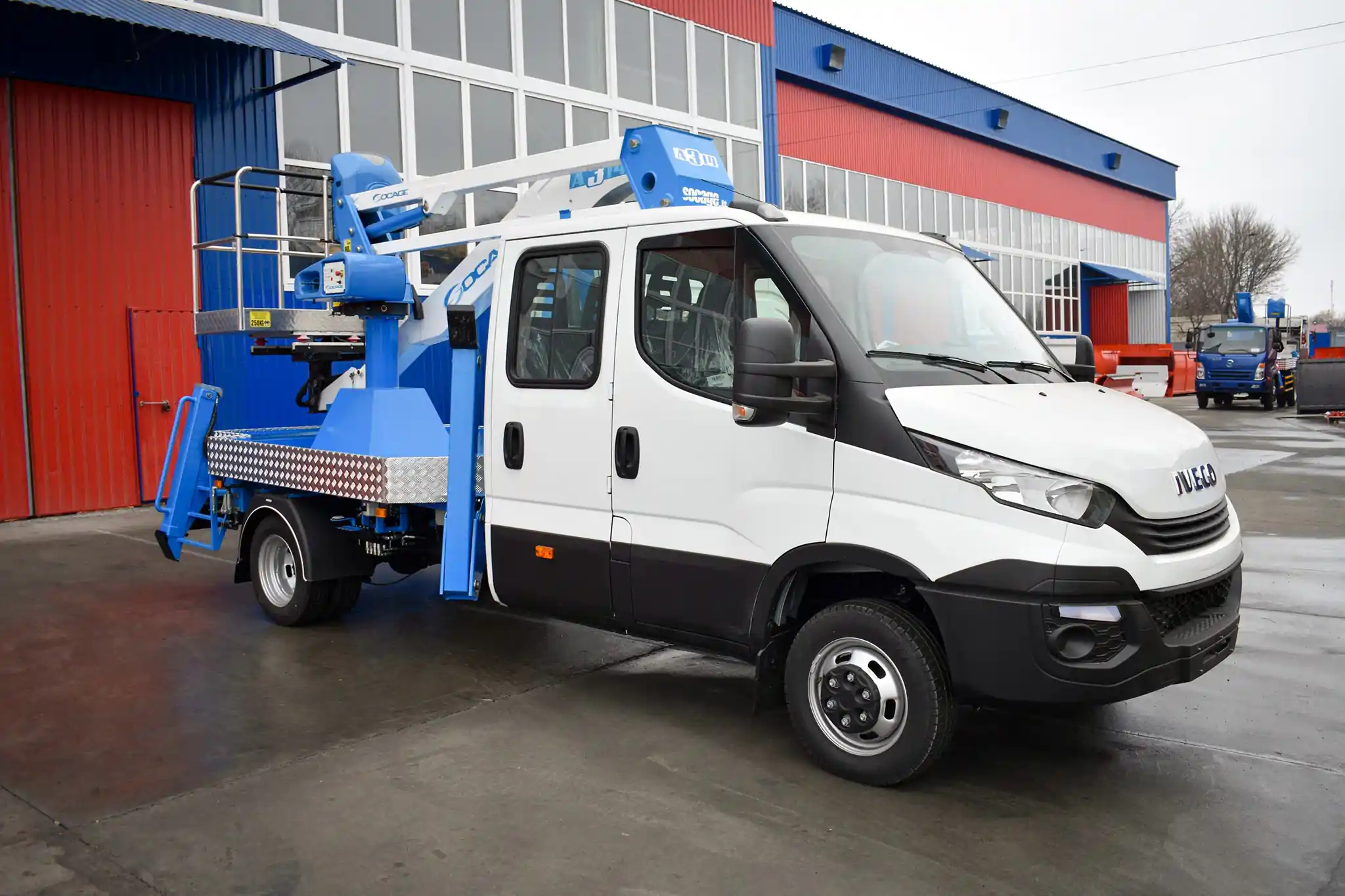 Що ж до другої машини, то це більш компактна модель Socage A314, встановлена на малотоннажному шасі IVECO Daily з дворядною кабіною. Вона має робочу висоту 13,7 м, виліт 7,1 м та корзину вантажопідйомністю 250 кг.
