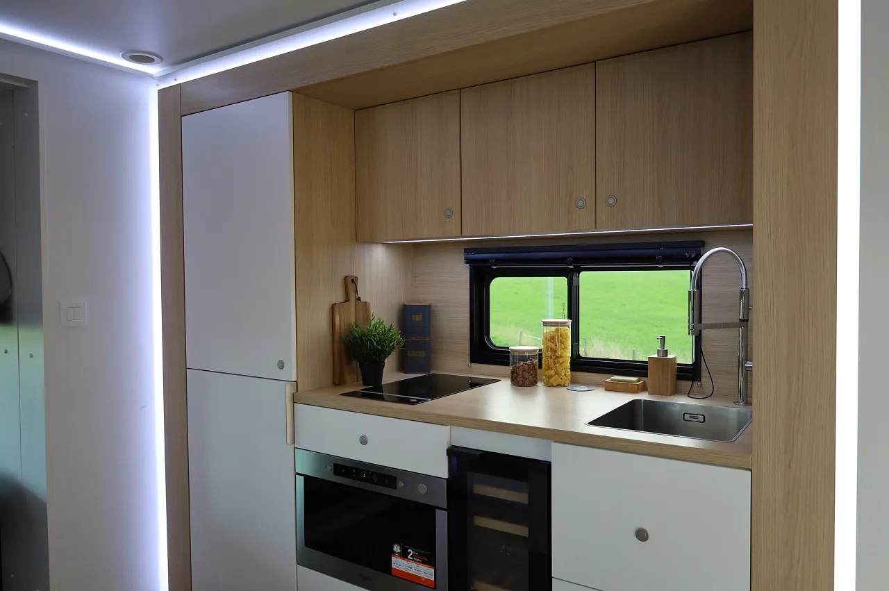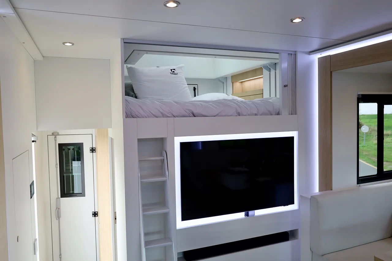 Оснащення не поступається люксовим кемперам. Тут є кухня з духовкою, плитою та раковиною, а також ванна кімната з душовою кабіною та 400-літровим баком для води. Є обідній стіл на шістьох, телевізор, домашній кінотеатр та навіть невеликий винний льох.