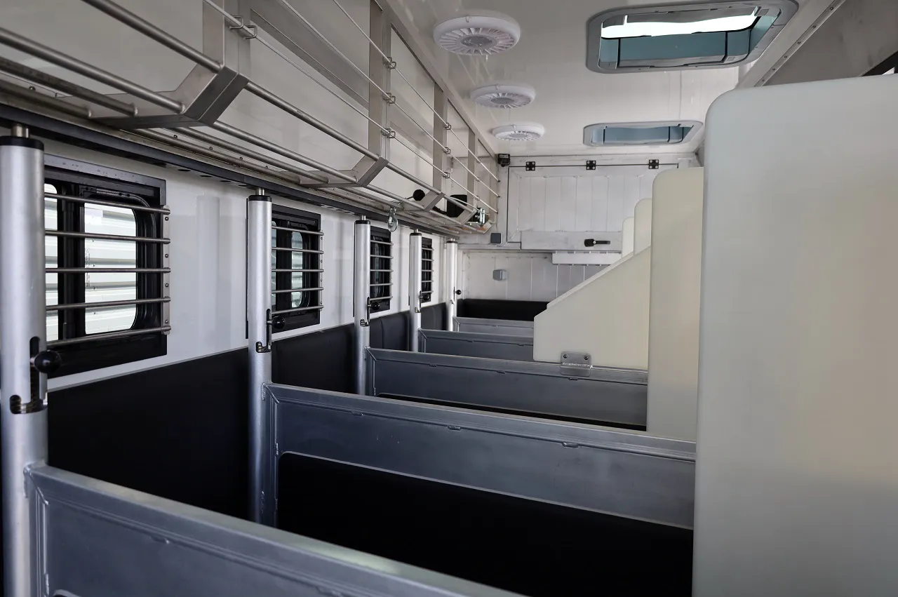 Що ж до відсіку для коней, то замовник може обрати комплектацію на чотири стійла або на вісім, кожне з яких відокремлено перегородкою. Особливу увагу приділено тепло-і звукоізоляції, щоб не лякати тварин. Алюмінієва підлога посилена трьома шарами: 15-мм деревом фінського походження, 10-мм комфортної піни та 10-мм гумовим килимком.